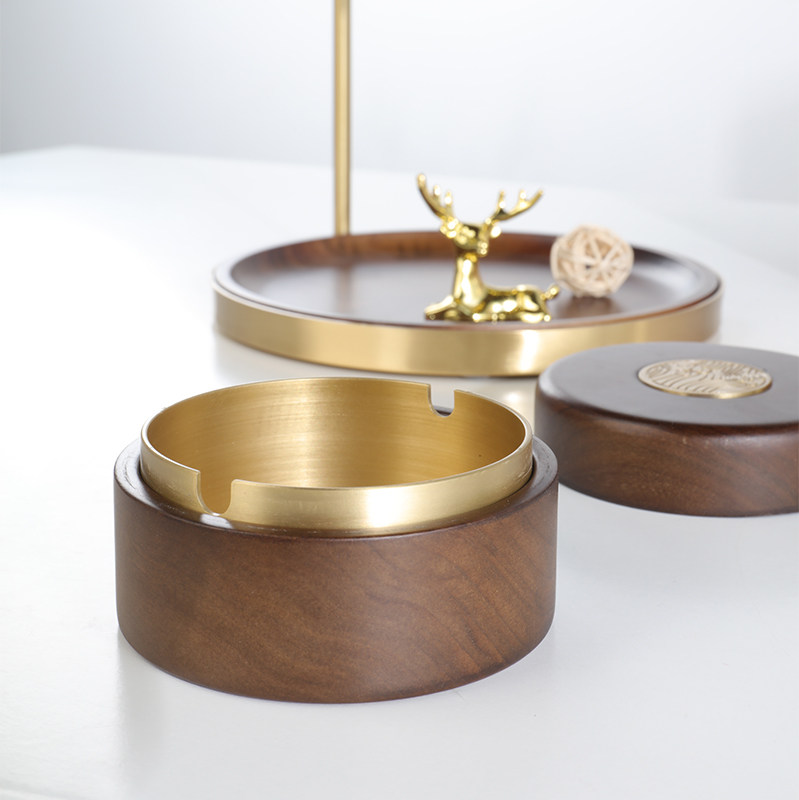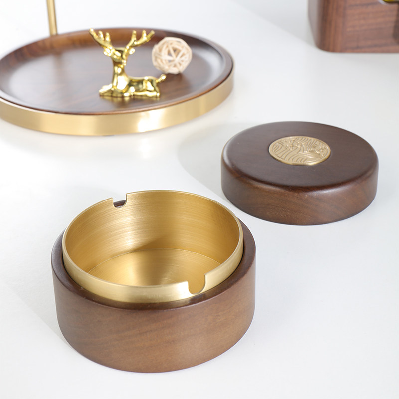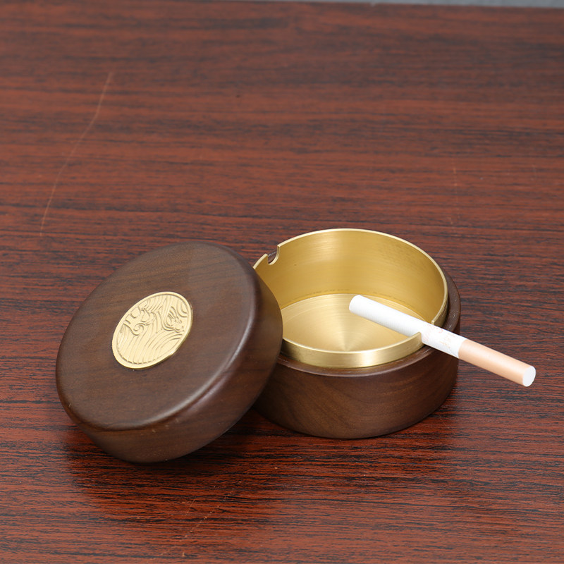 黑胡桃木轻奢烟灰缸美式高端复古防飞灰高级感家用客厅带盖烟缸