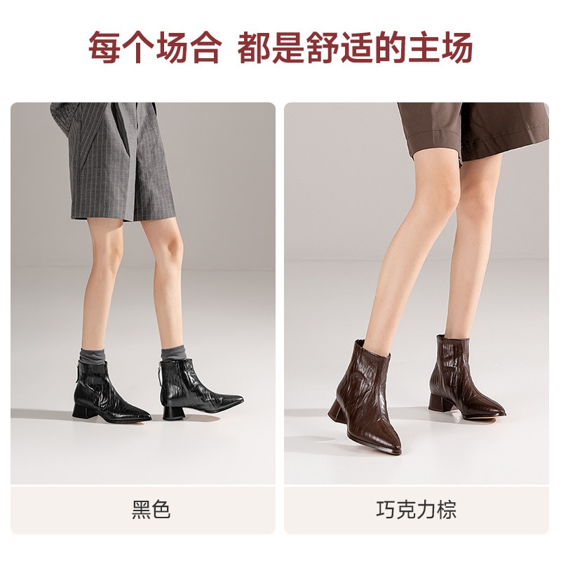 吴大叔2025秋冬复古尖头粗跟短靴气垫缓震简约百搭真皮切尔西女靴