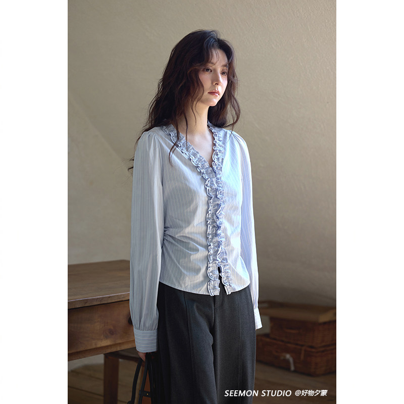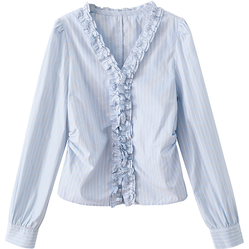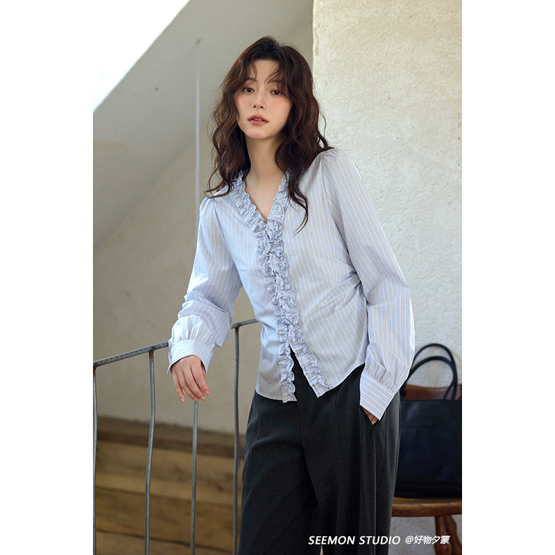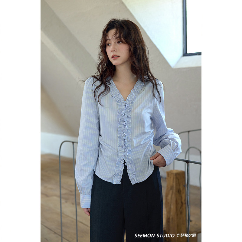 夕蒙2025新款秋季韩系气质上衣小个子高级设计感花边浅蓝条纹衬衫