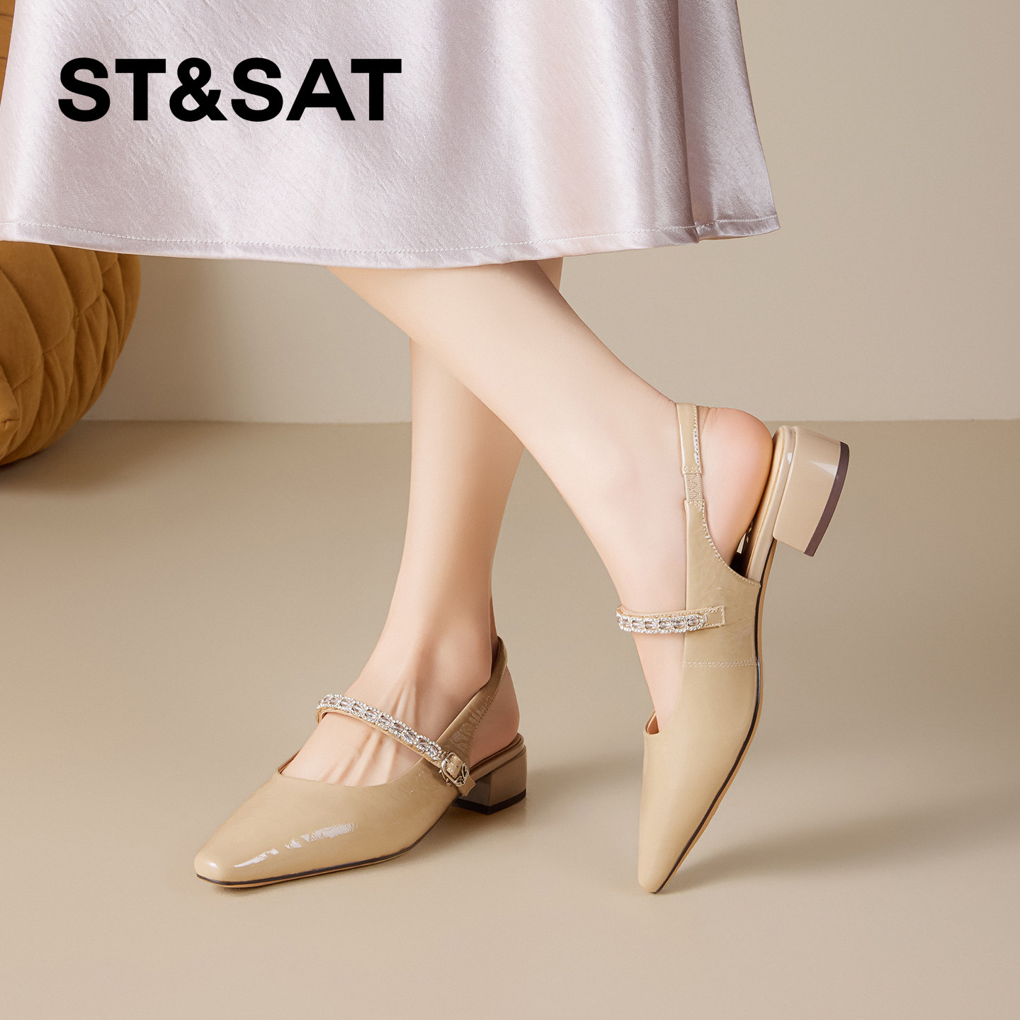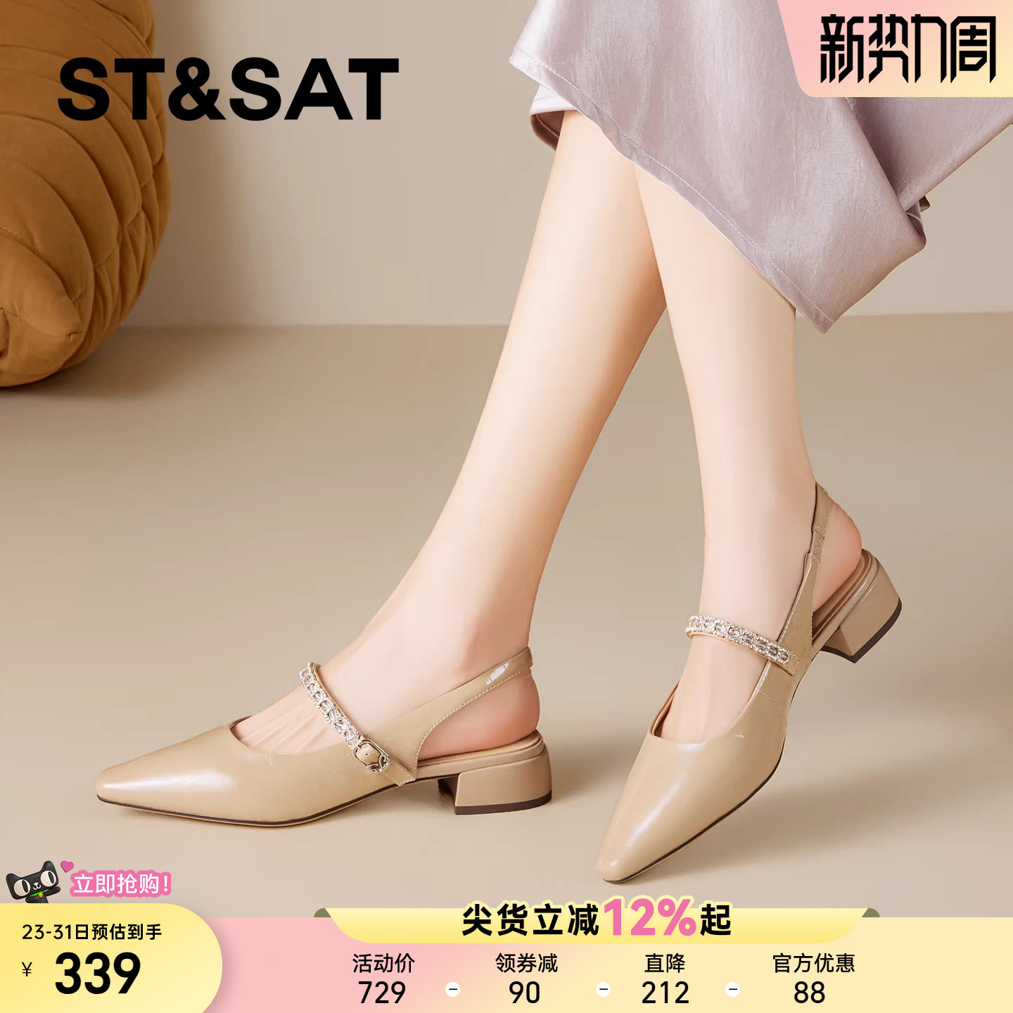 星期六真皮粗跟包头凉鞋女2026年夏季新款方头水钻一字带后空单鞋