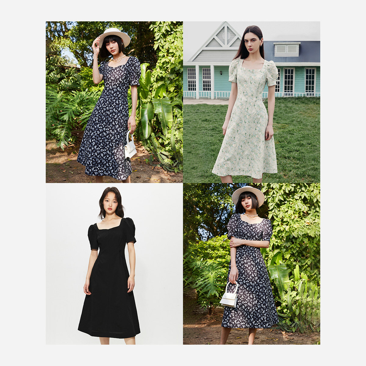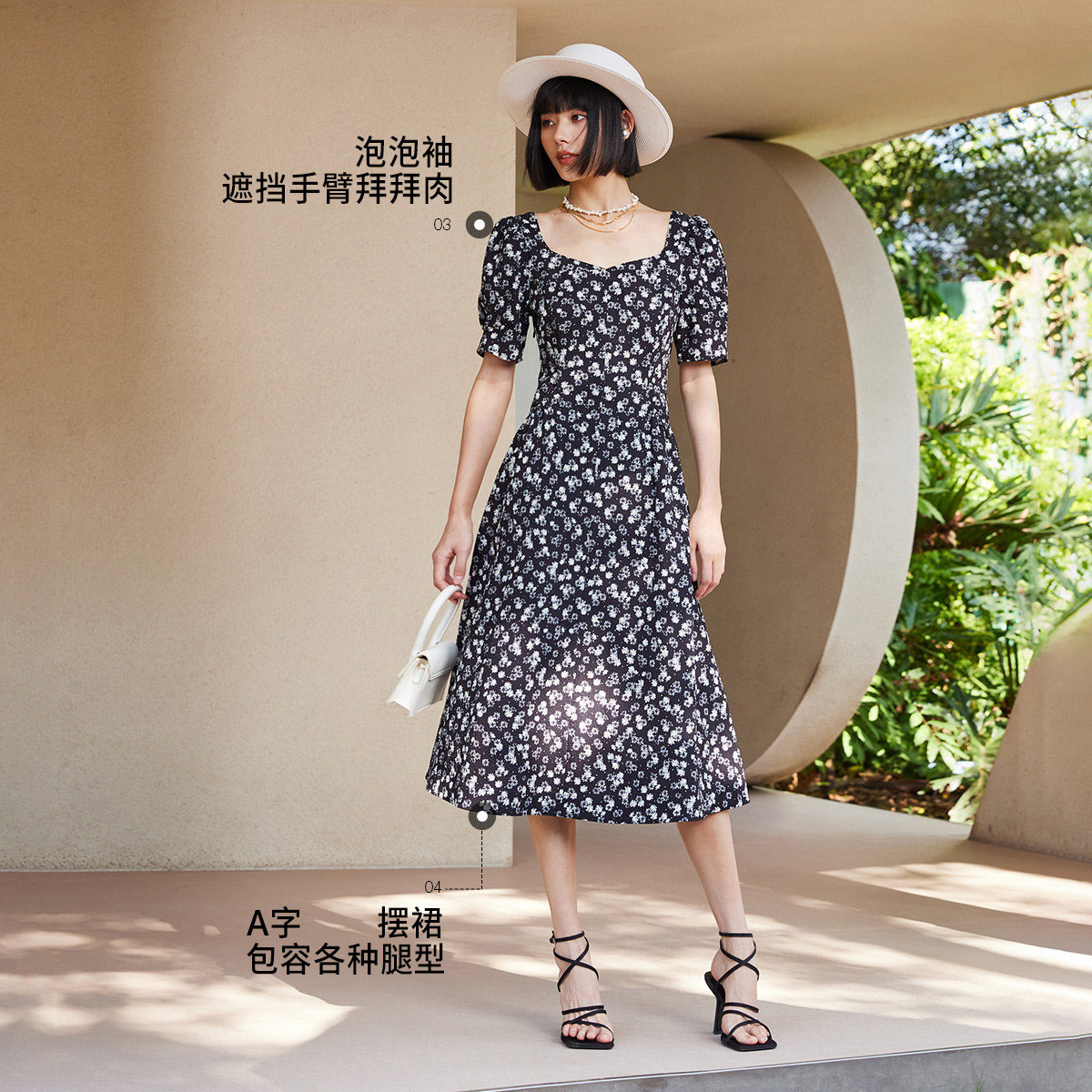 【ONLY奥莱】春季新款气质度假碎花复古方领泡泡袖中长裙连衣裙女