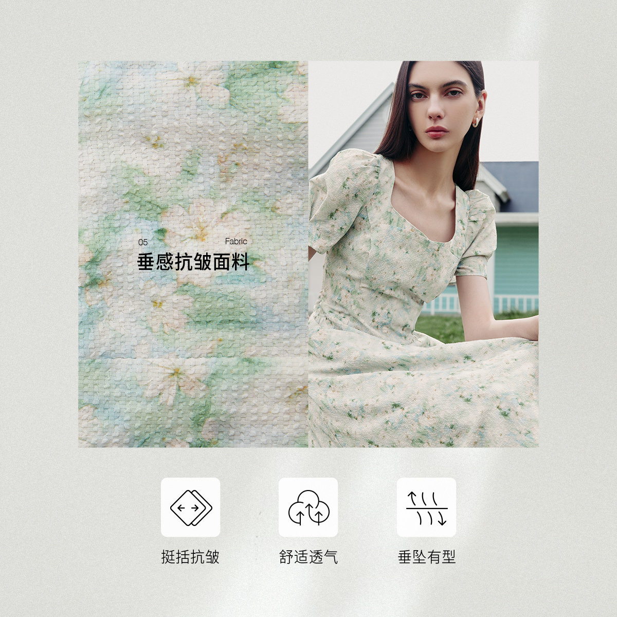 复古方领领口 捏褶泡泡袖 捏褶弧形口袋