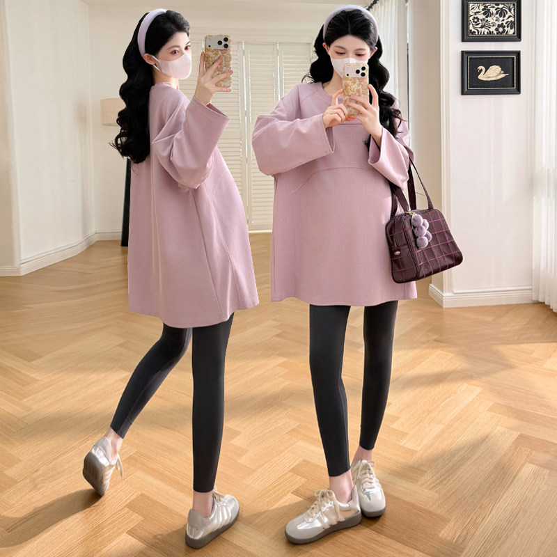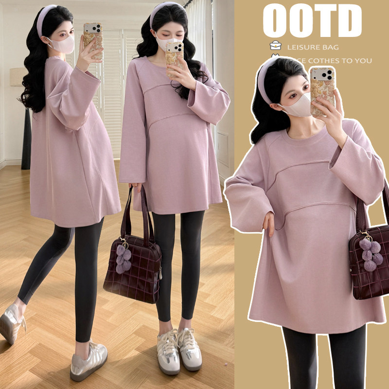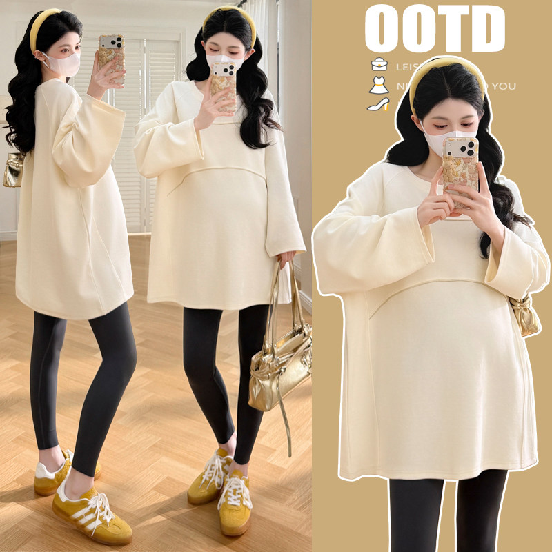 婧麒孕妇上衣2026新款长袖宽松休闲中长款遮肚上衣春秋季潮妈外出