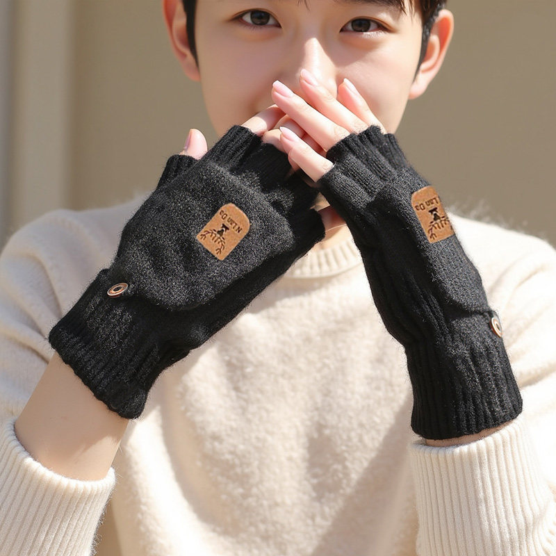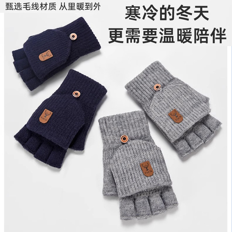 手套冬天半指加绒加厚翻盖情侣学生写字韩版秋冬针织毛线骑行保暖