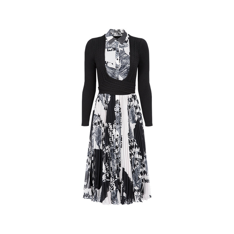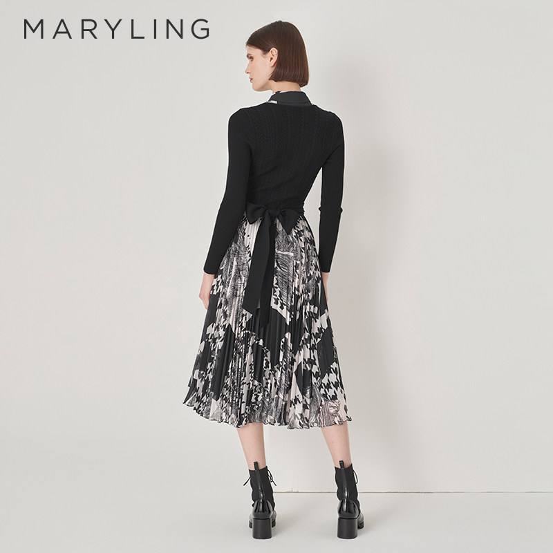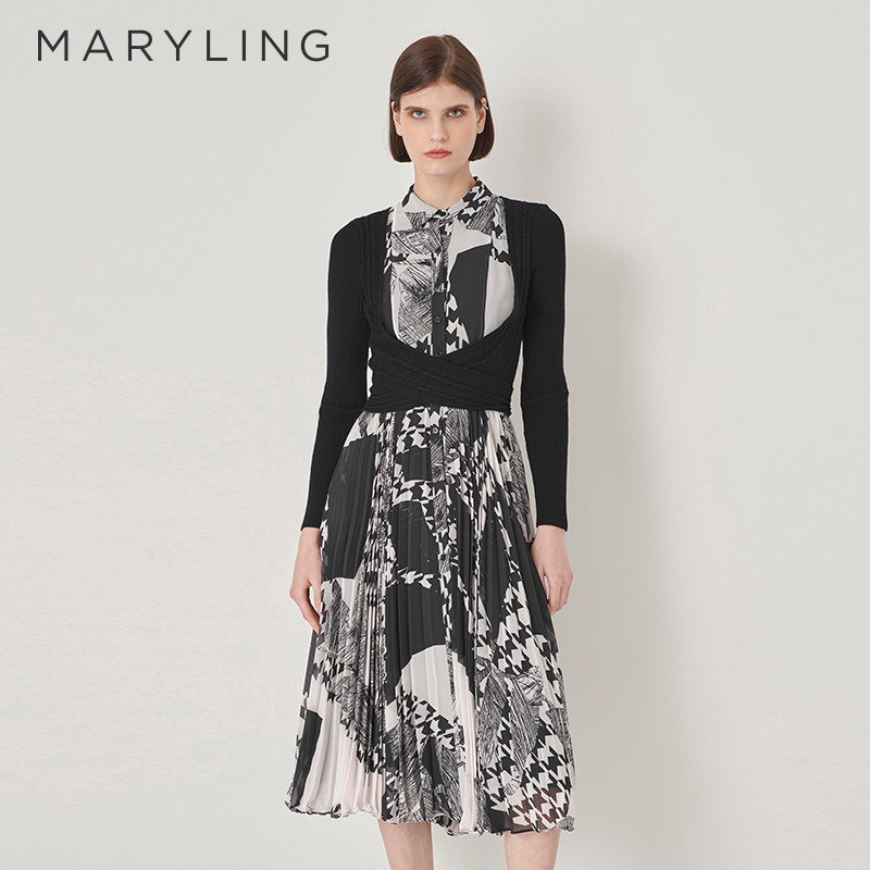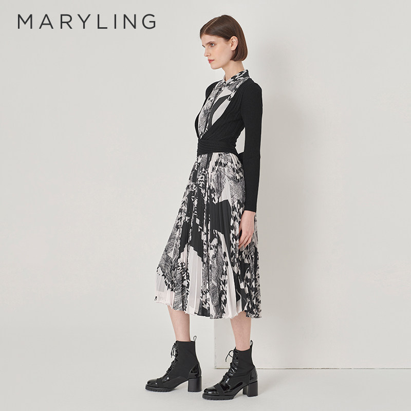 MARYLING玛俪琳秋季新品黑白色长袖印花收腰连衣裙衬衫领气质长裙
