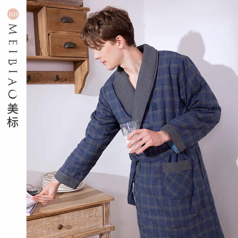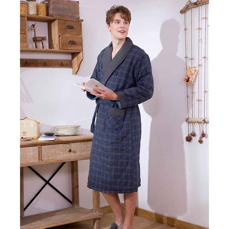 美标纯棉睡袍男士秋冬格子浴袍加厚睡衣全棉质家居服