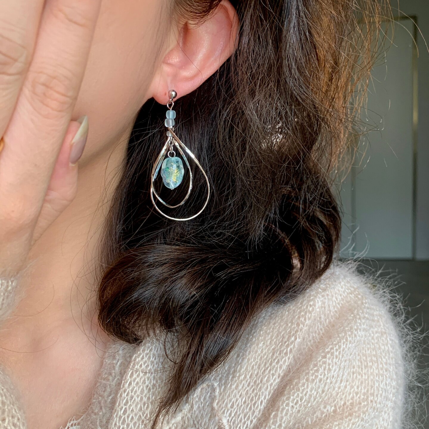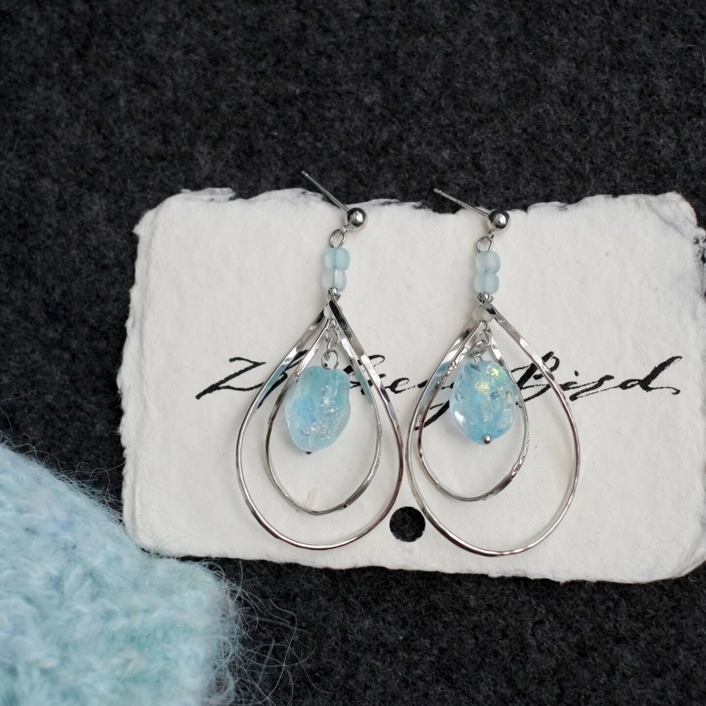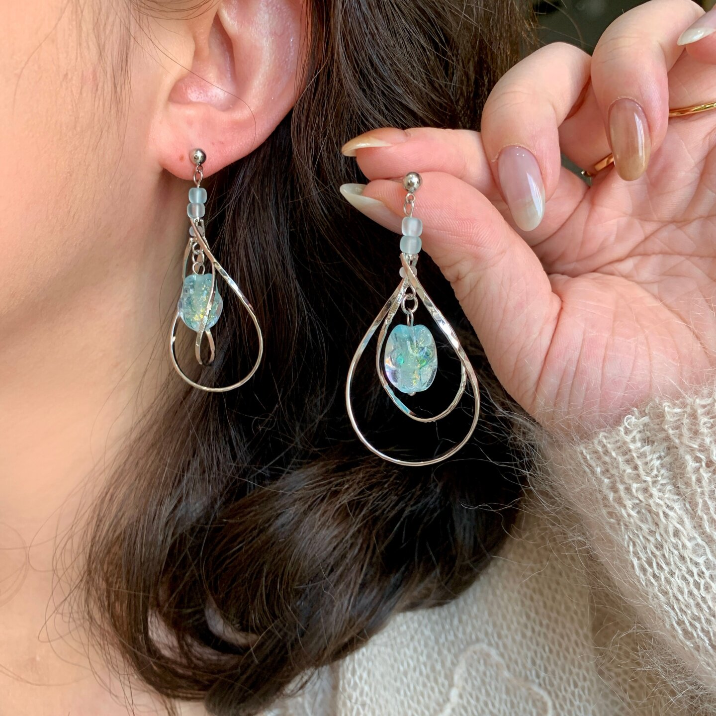 《碧波》原创小众春夏清新蓝色琉璃珠圆圈长款耳夹耳饰耳钉耳环女