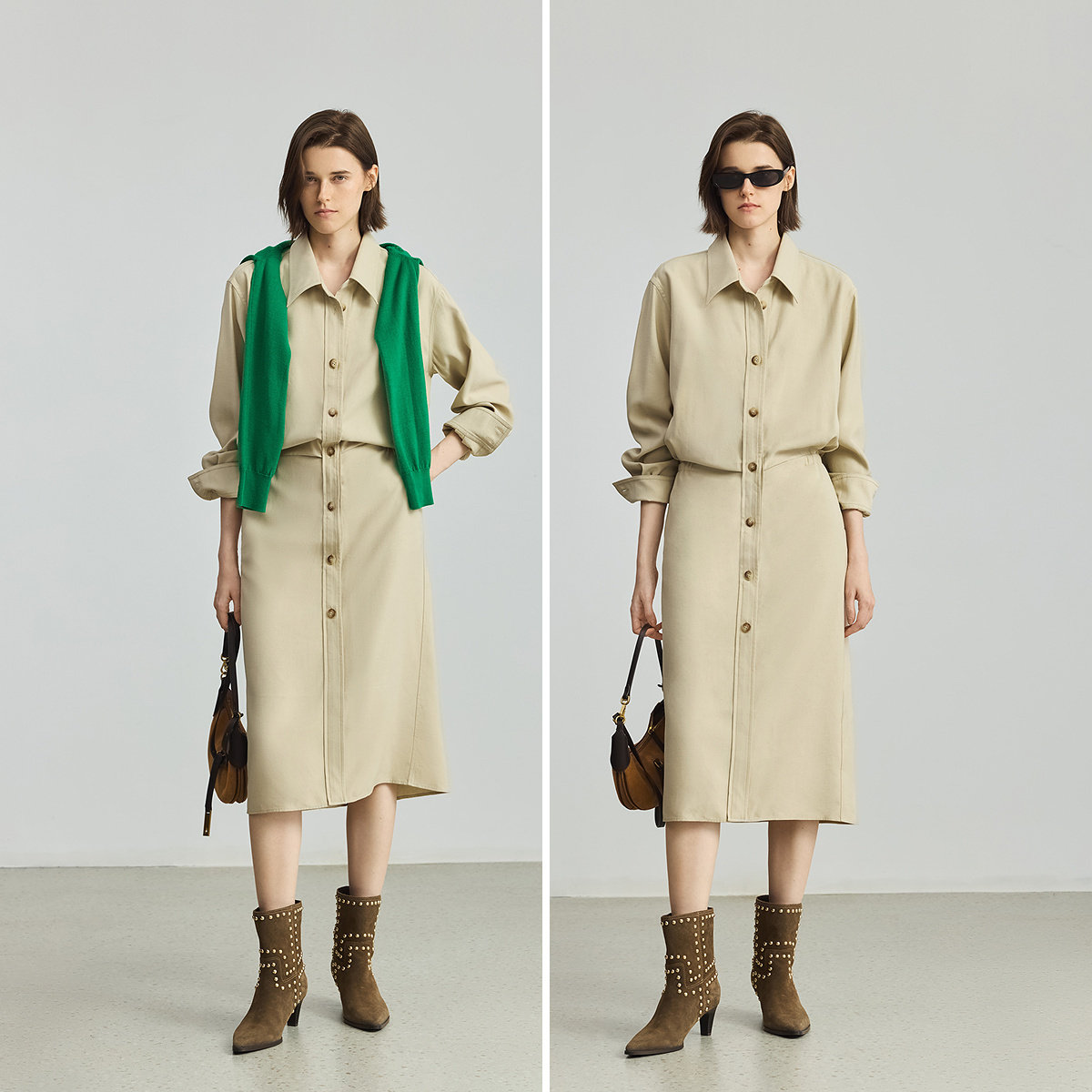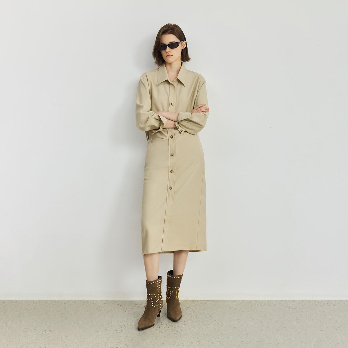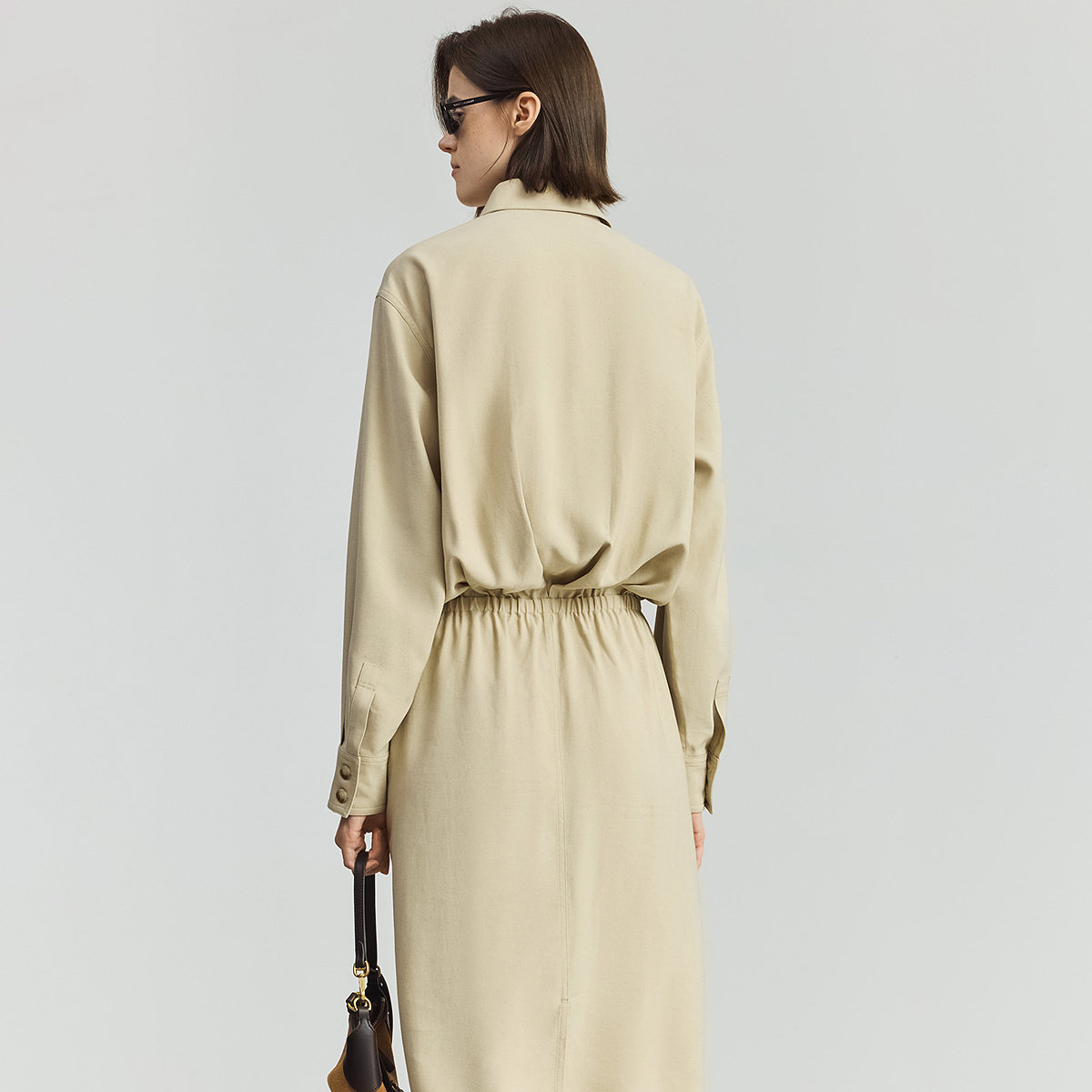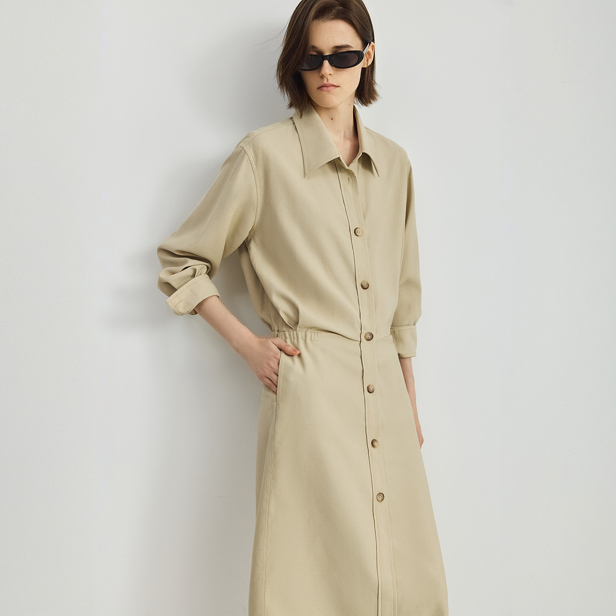 LILY2025新款含亚麻工装收腰休闲通勤直筒衬衫裙卡其色连衣裙女