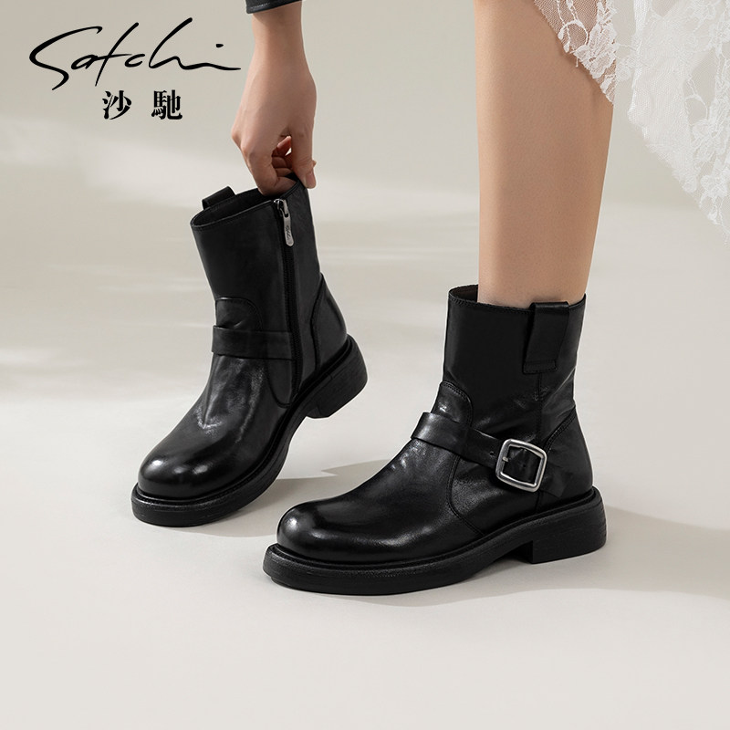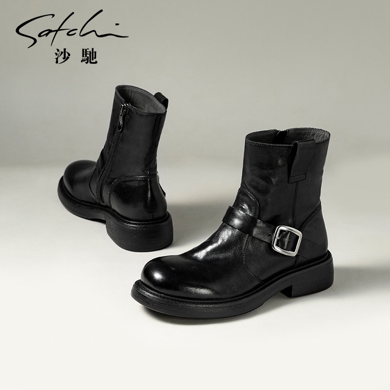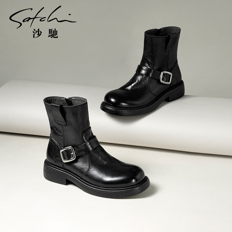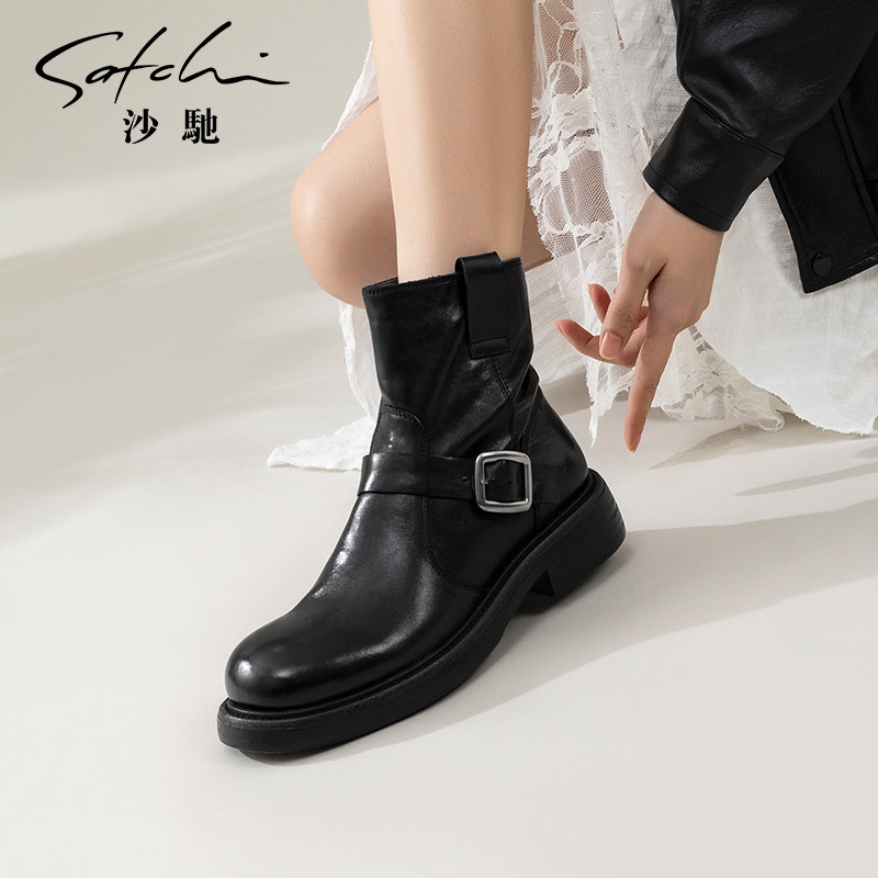 沙驰女鞋皮带扣牛皮短靴2025年冬季新款平跟短筒圆头时装马丁靴子