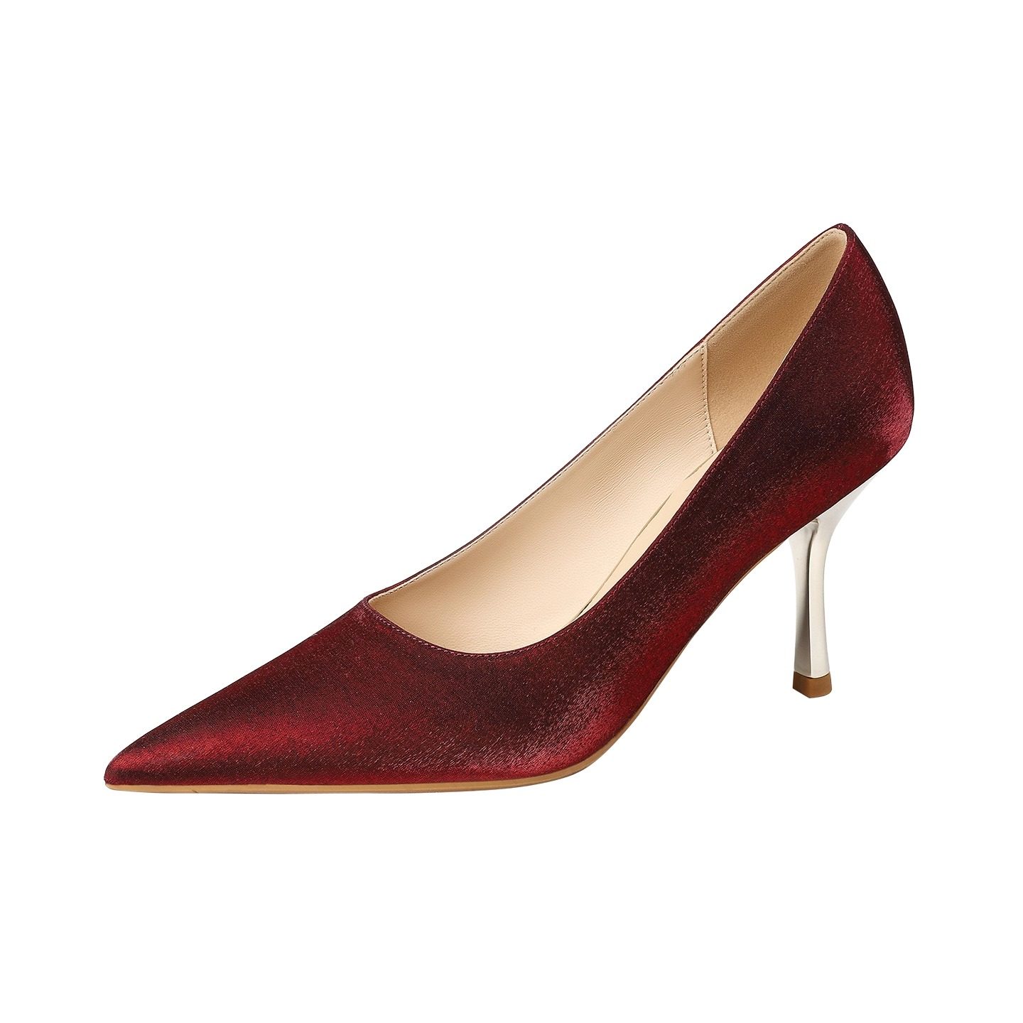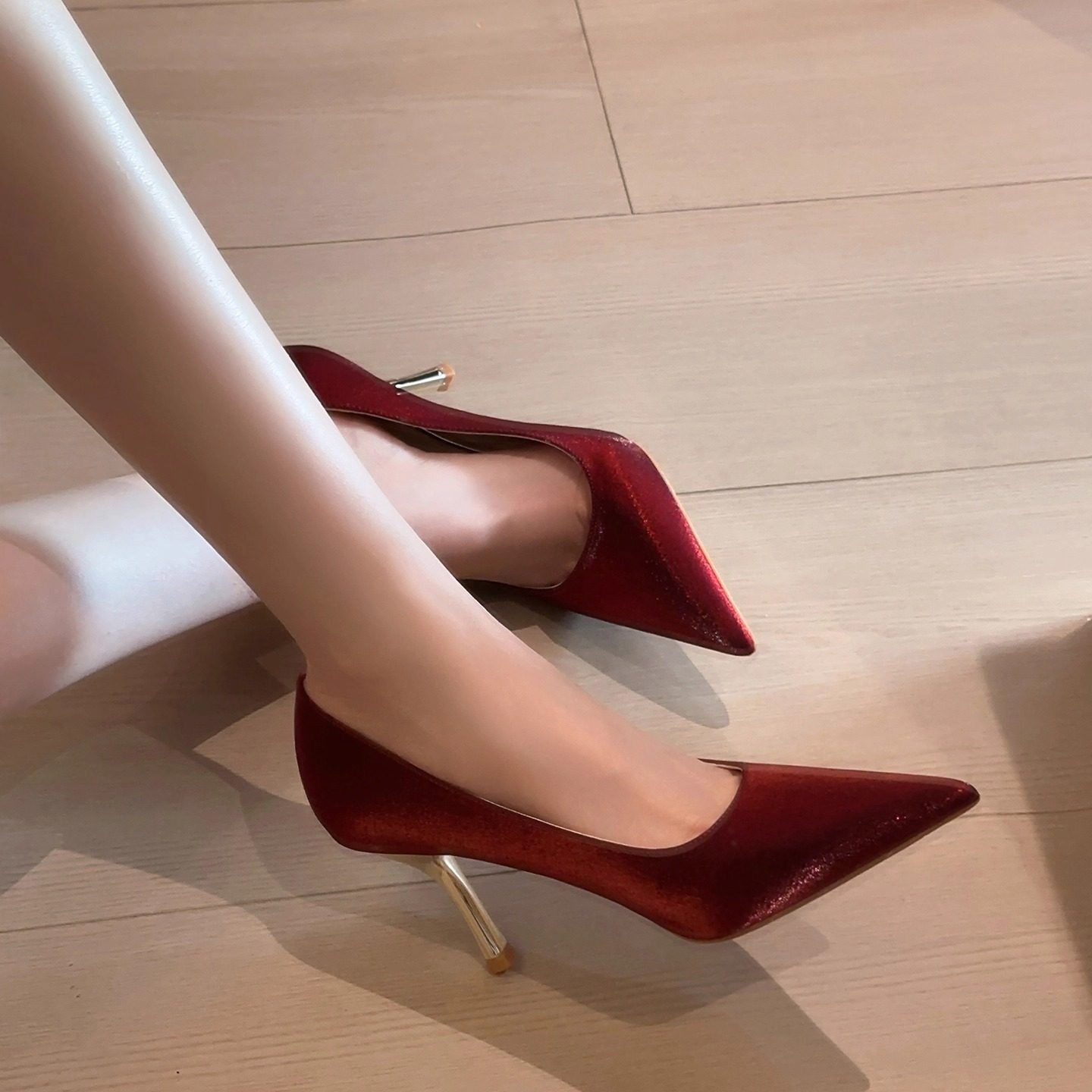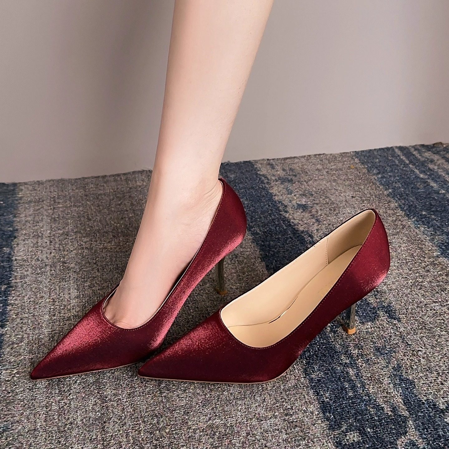 酒红色高跟鞋女2025新款中式秀禾敬酒服新娘鞋不累脚尖头绸缎单鞋