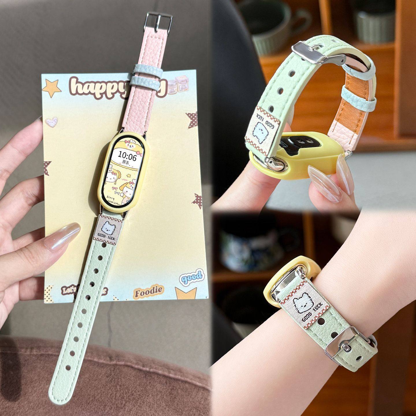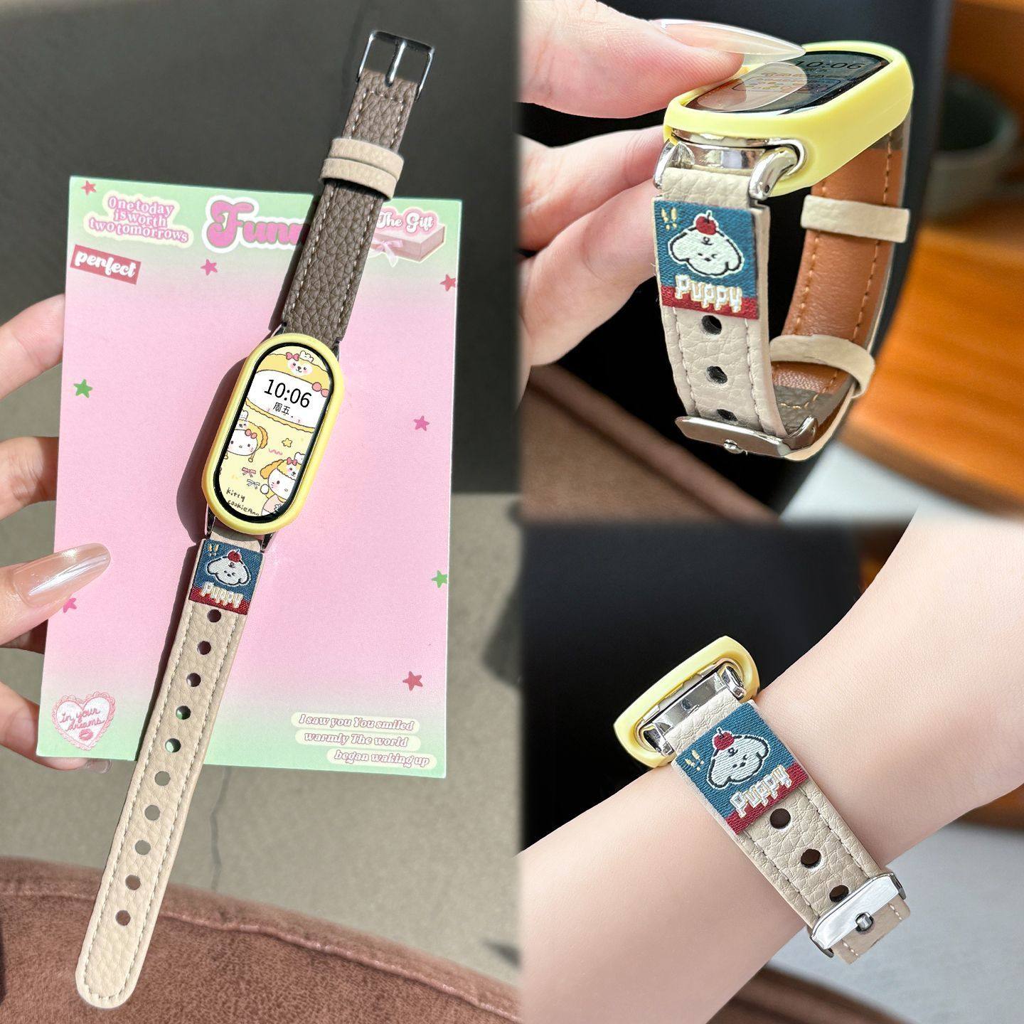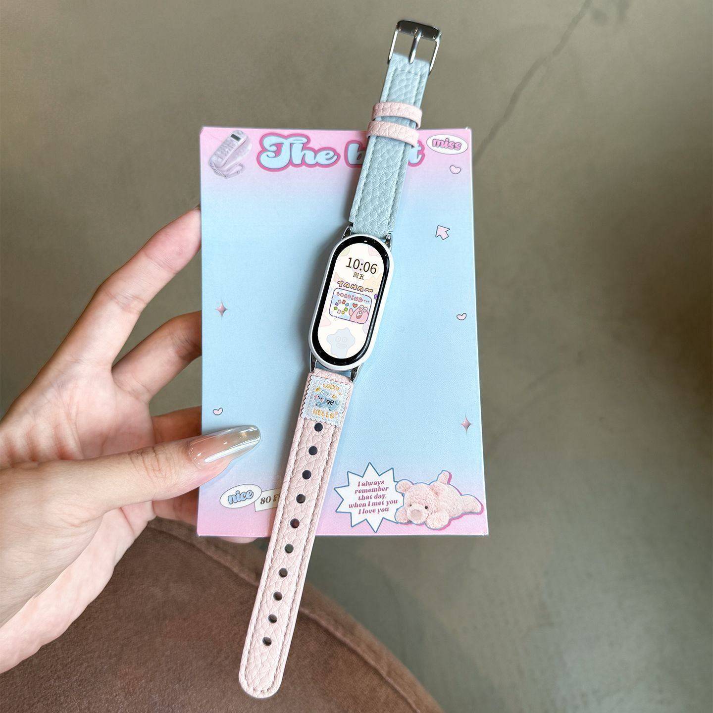 卡通布标适用小米手环10表带皮质荔枝纹撞色腕带9时尚8陶瓷版八九代配件高级感个性秋冬女士小红书同款ins风