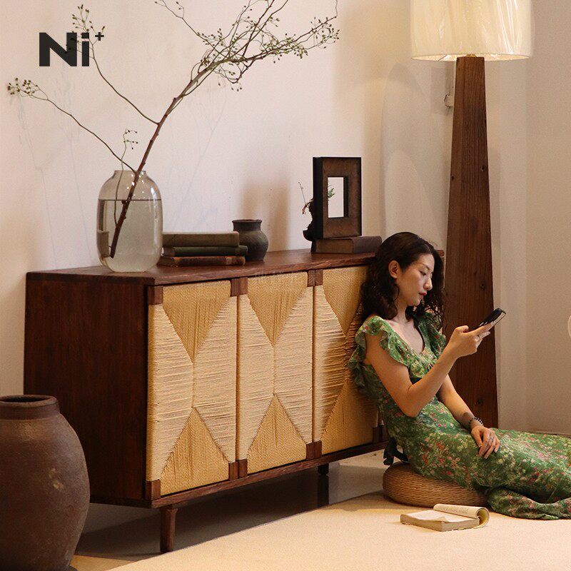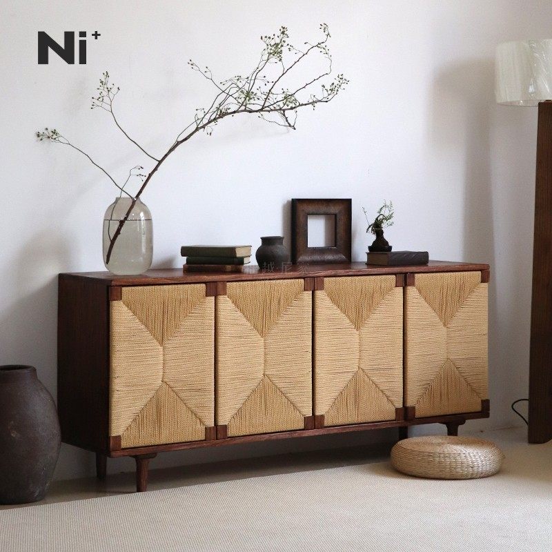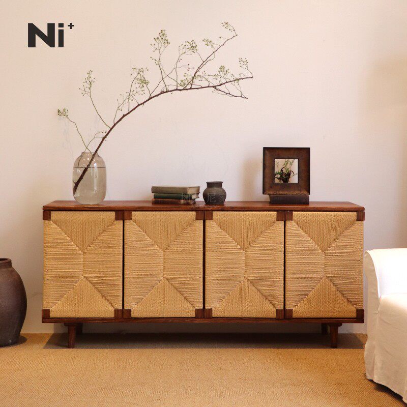 Ni尼家复古餐边柜实木法式玄关柜中古藤编收纳柜民宿酒店备餐柜子
