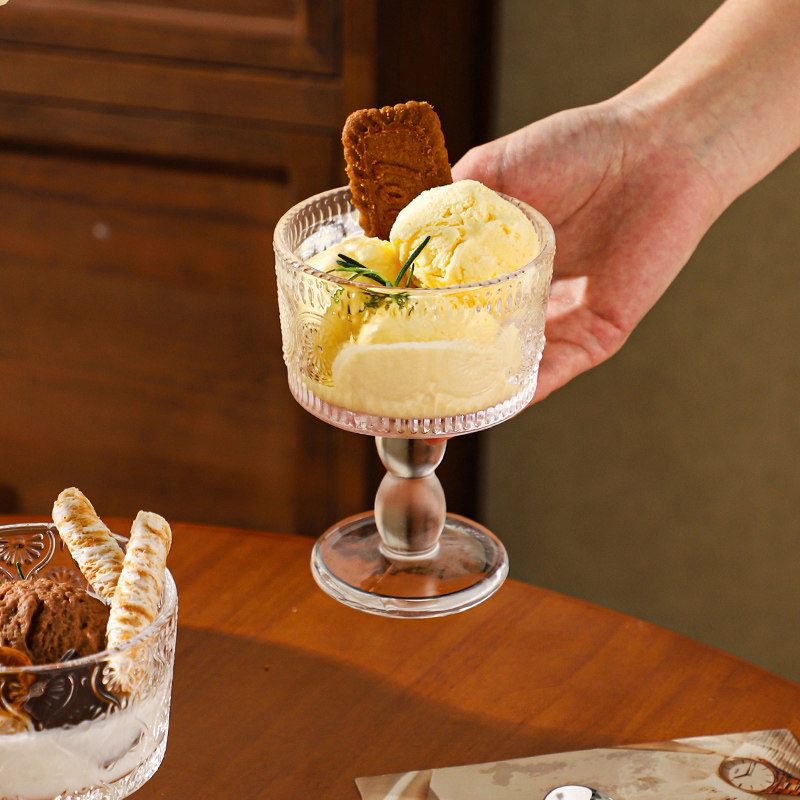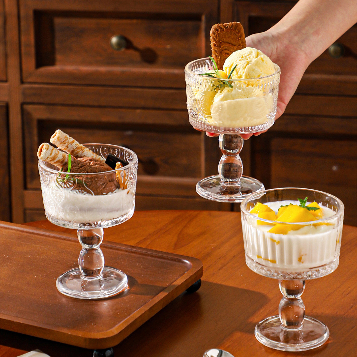 舍里中古浮雕玻璃杯淇淋甜品杯高颜值家用酸奶奶昔雪糕杯高脚杯