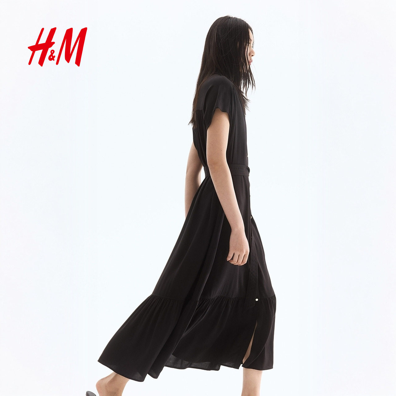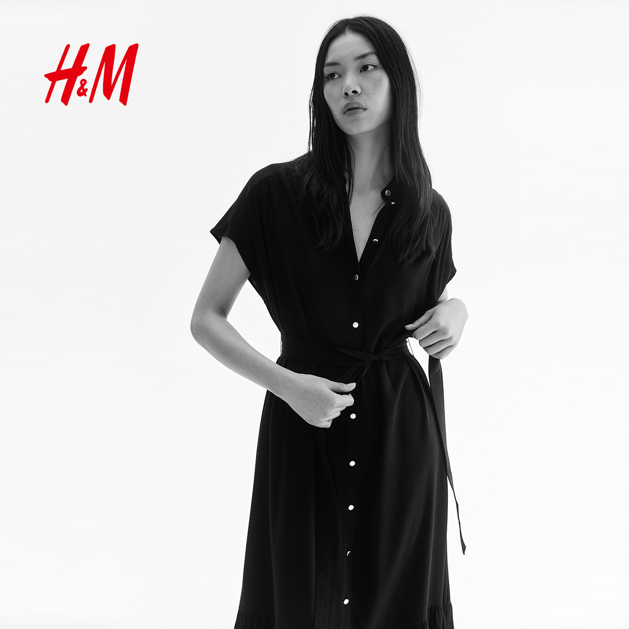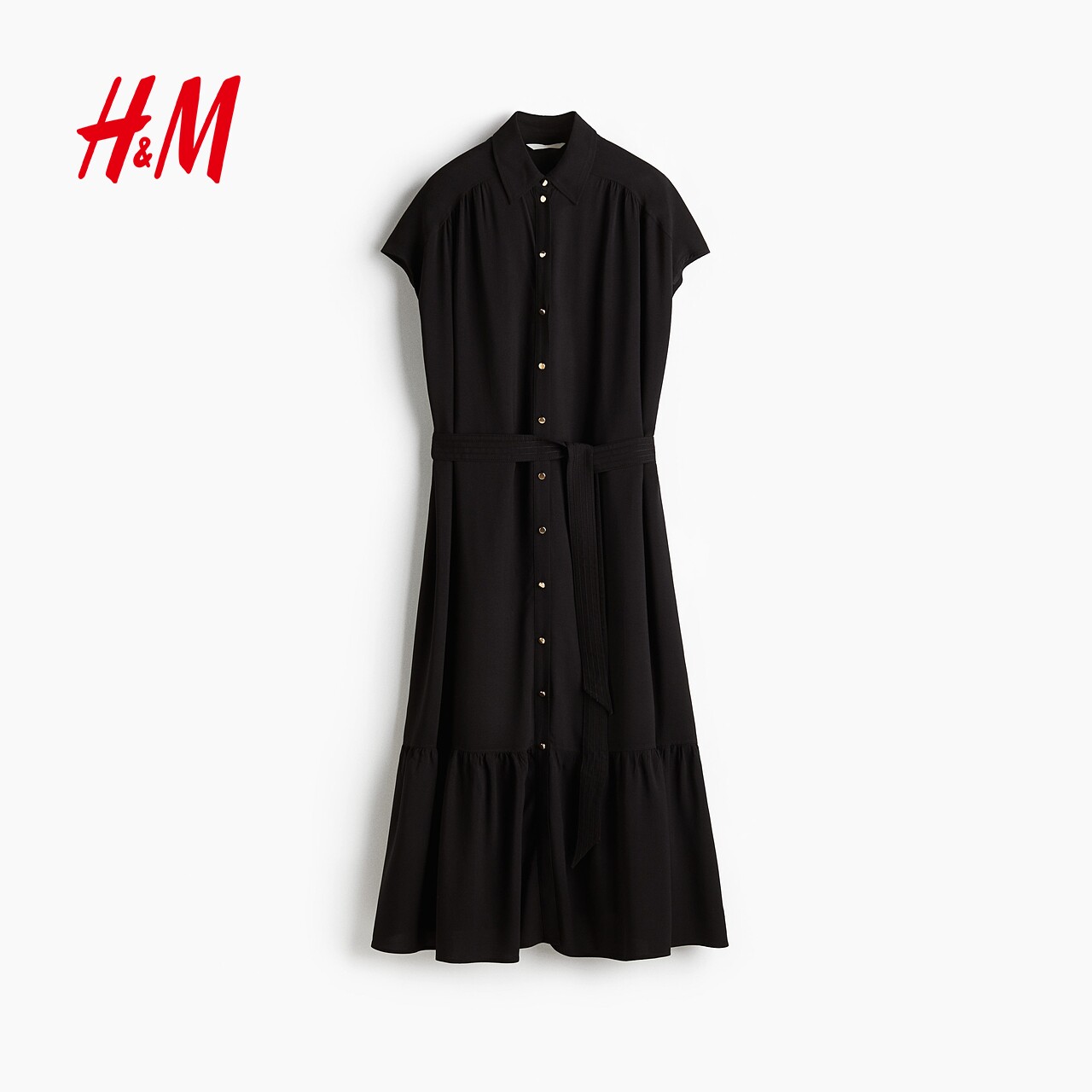 HM女装连衣裙春季时尚系带束腰衬衫包袖连衣裙1297805