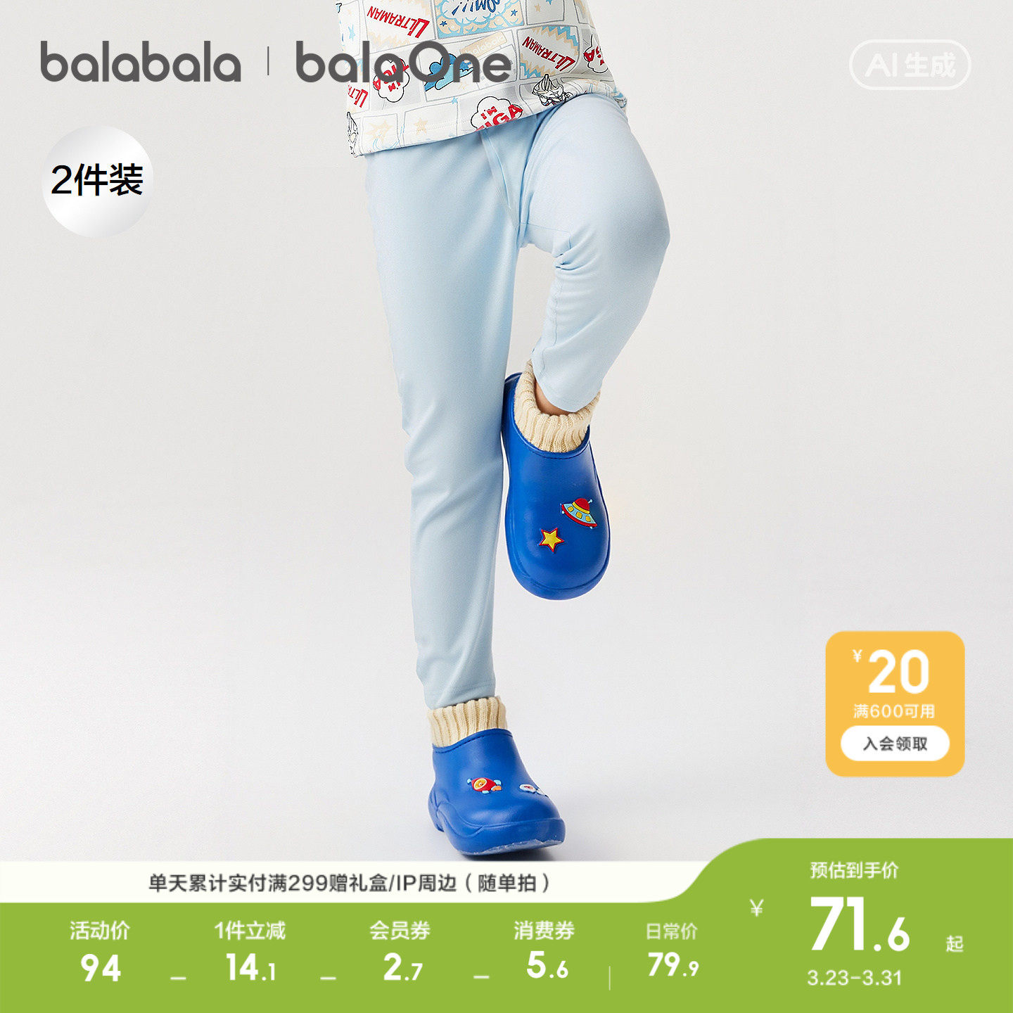 【balaOne】巴拉巴拉儿童保暖裤男童2026新款春睡裤打底裤两件装