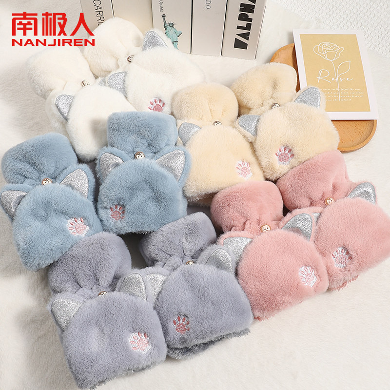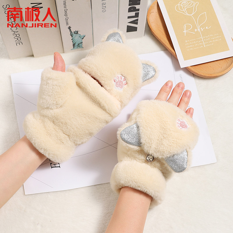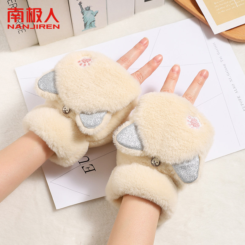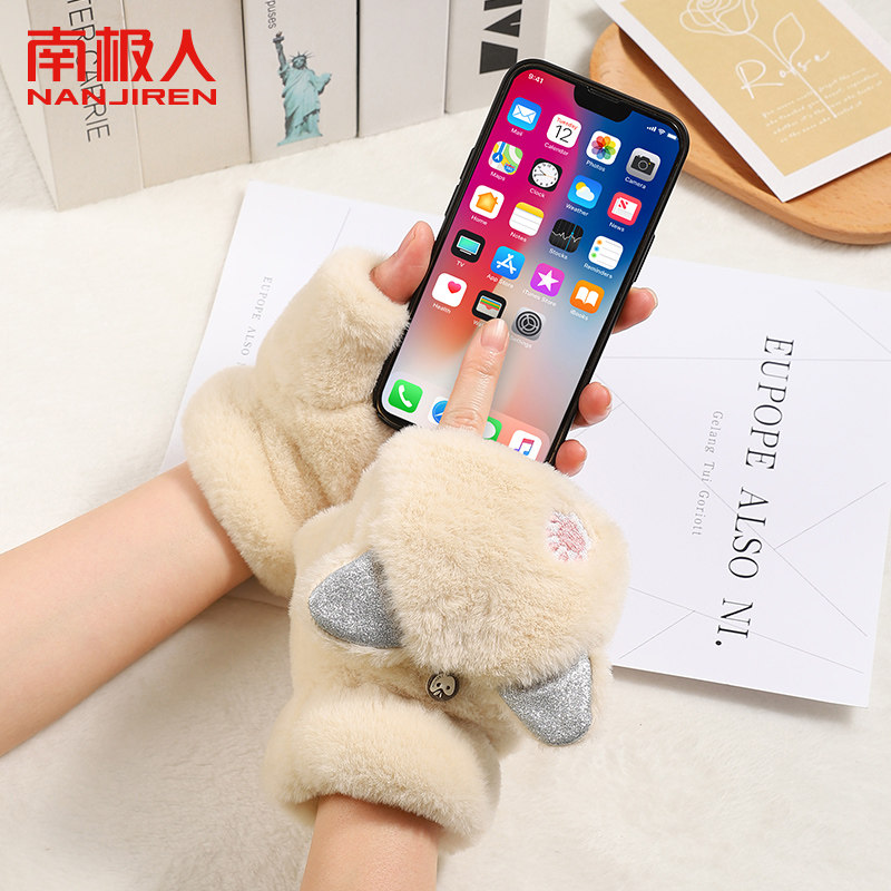 冬季可爱毛绒手套女加绒厚防寒学生骑行写字手套女翻盖触屏手套H