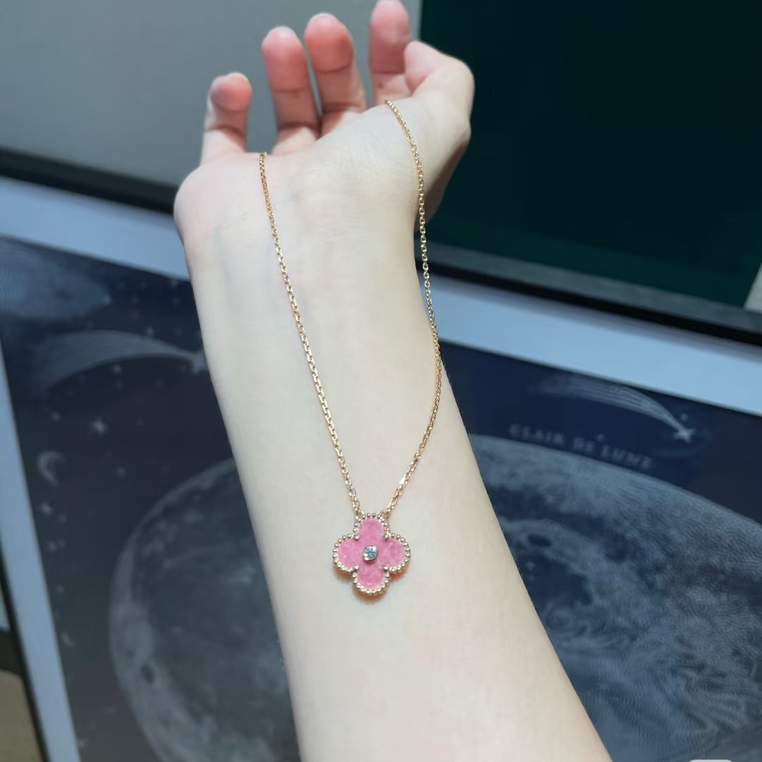 全新高定品质粉蔷薇石天河石粉贝母中钻项链圣诞款玫瑰925银