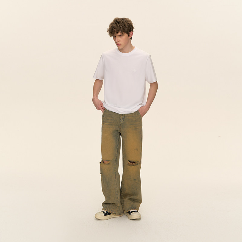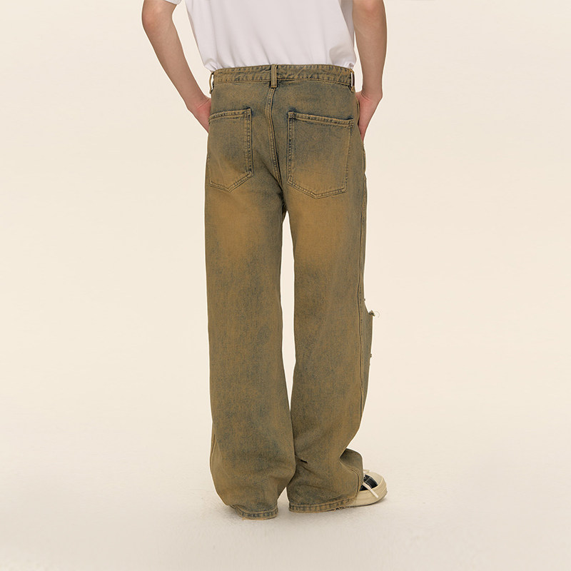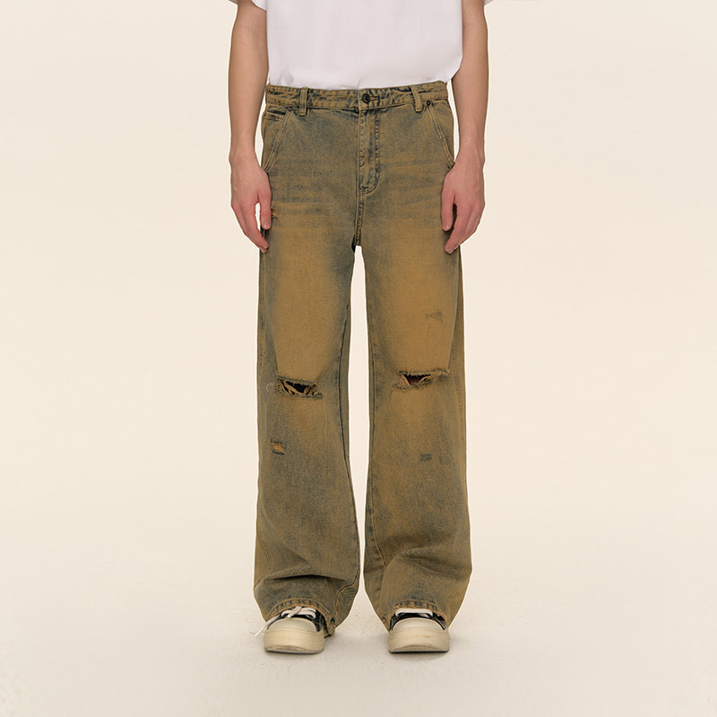 CLIMAX VISION脏洗做旧破洞低腰阔腿牛仔裤男美式高街直筒长裤潮