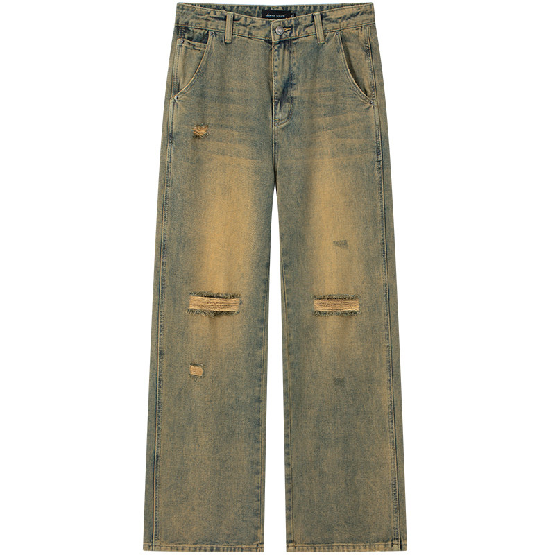 UNKNOWTAL 水洗做旧黄泥蓝浅色直筒牛仔裤弹性宽松休闲百搭长裤