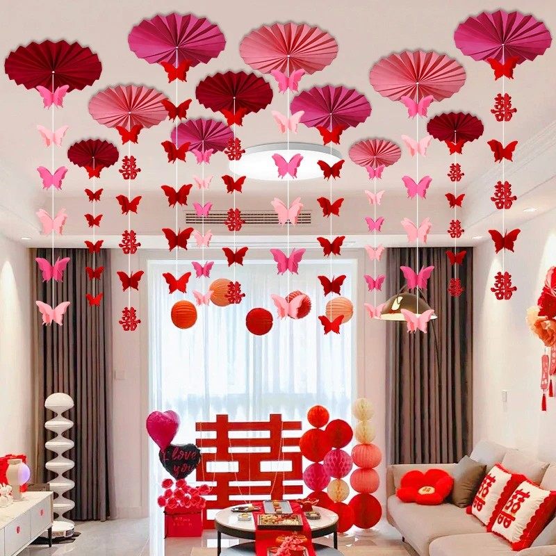 婚房布置喜字拉花吊顶装饰结婚礼男女方卧室新房客厅扇花挂饰用品