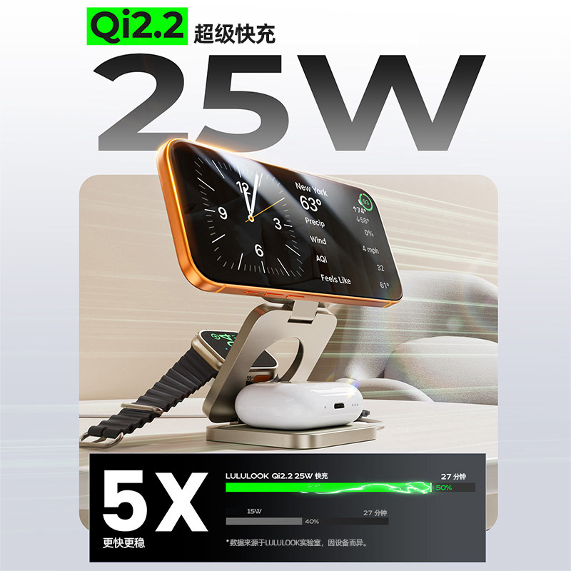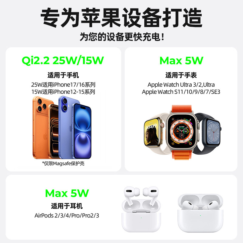 鹿洛可【新Qi2.2快充25W】三合一无线充电器适用苹果17ProMax手机iPhone16磁吸支架AirPods耳机Watch手表底座