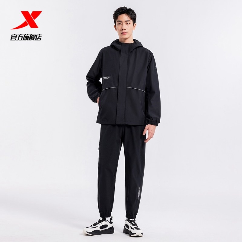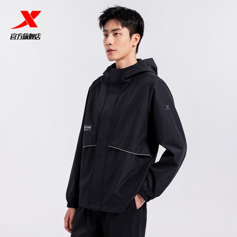 特步防泼水夹克外套男春秋季户外风衣连帽黑色上衣防风运动训练服