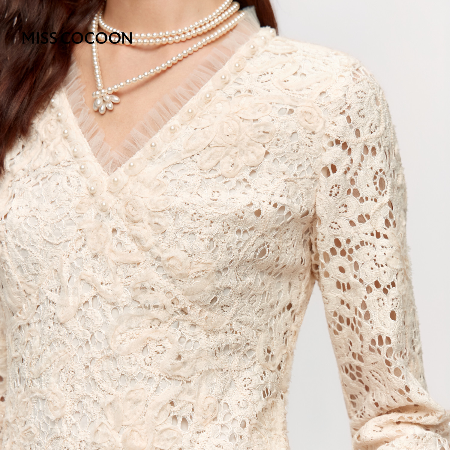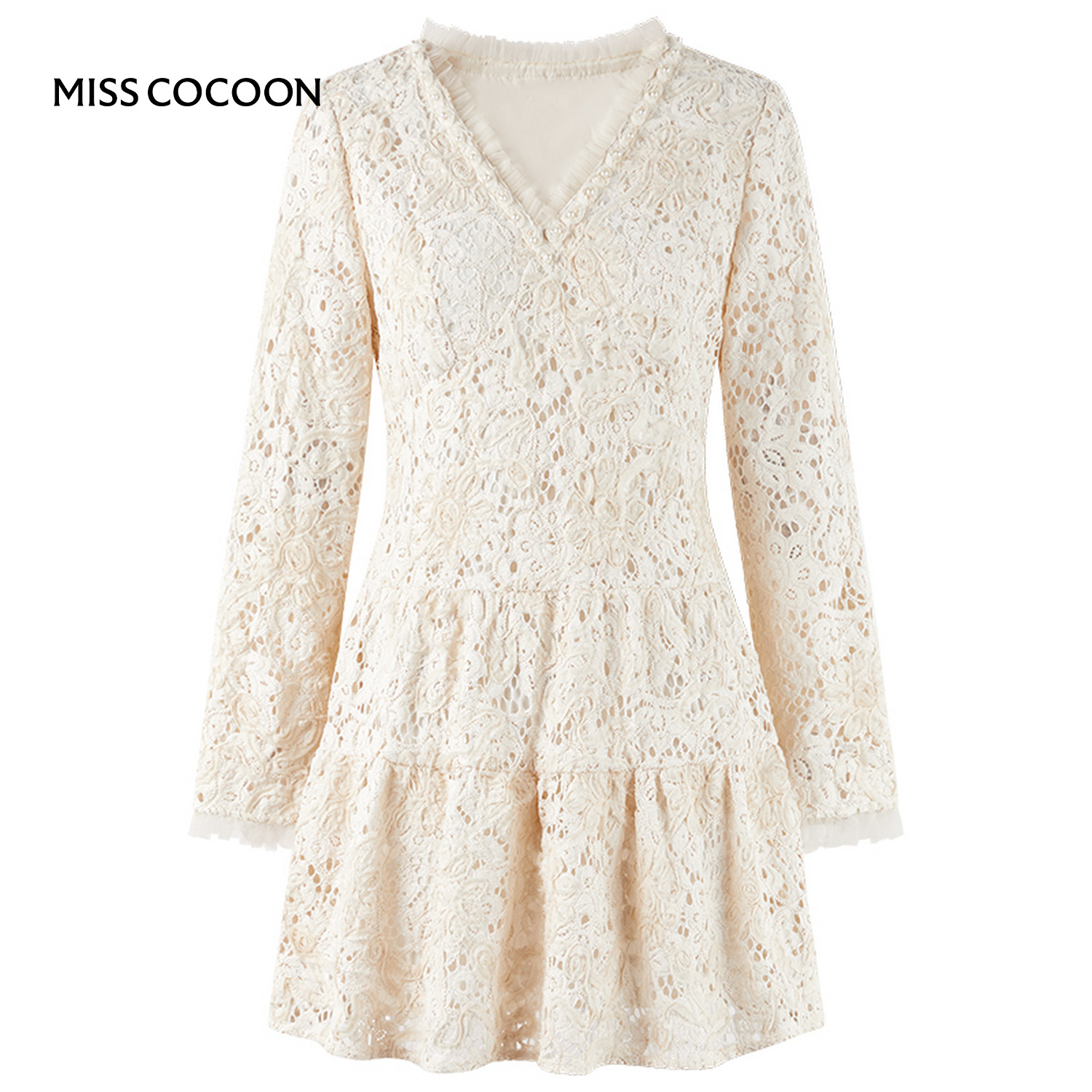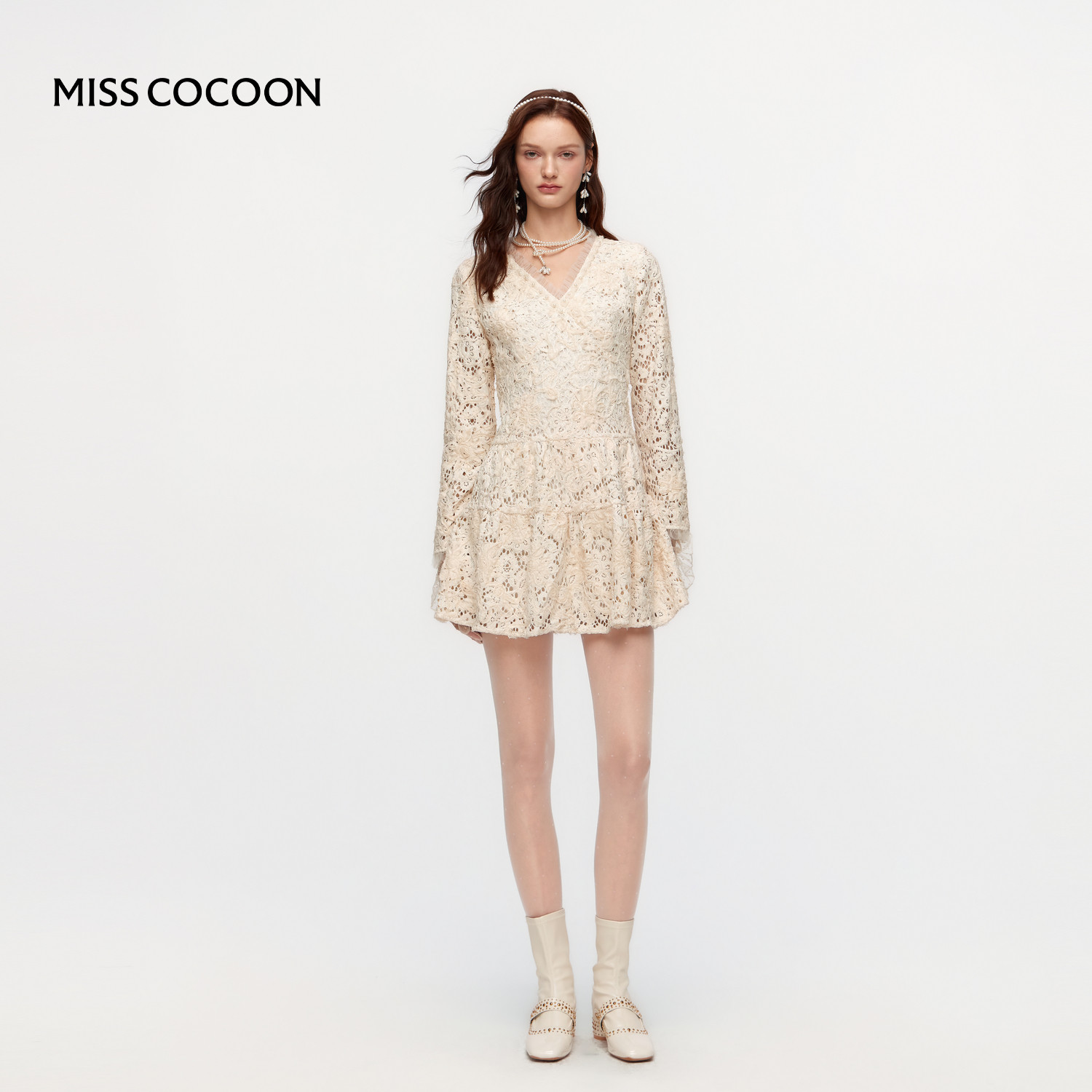 MISSCOCOON可可尼白色蕾丝裙子女2025冬季新款镂空V领显瘦连衣裙
