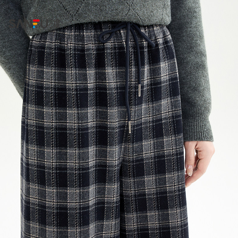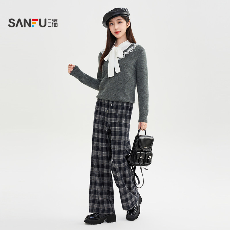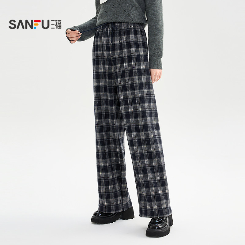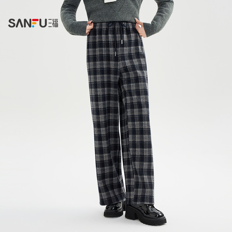 三福加绒裤子2025新款冬季宽松bf慵懒风格子阔腿休闲裤女装513111