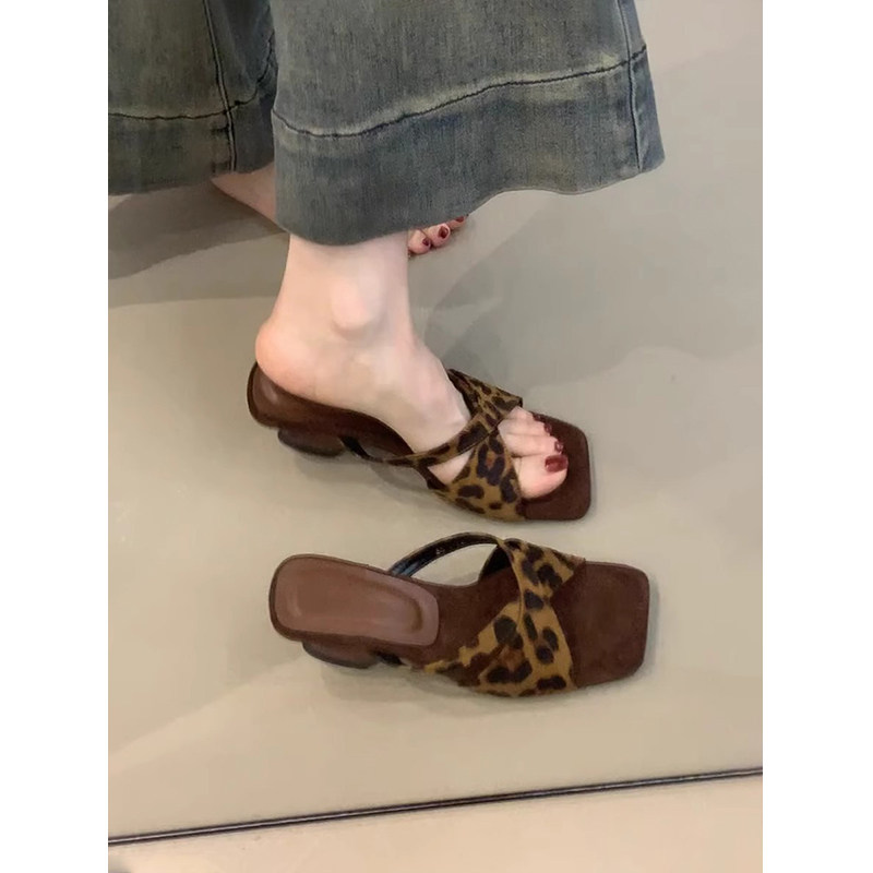 迷可薇薇复古豹纹高跟一字带凉拖鞋女夏外穿露趾方头气质坡跟凉鞋