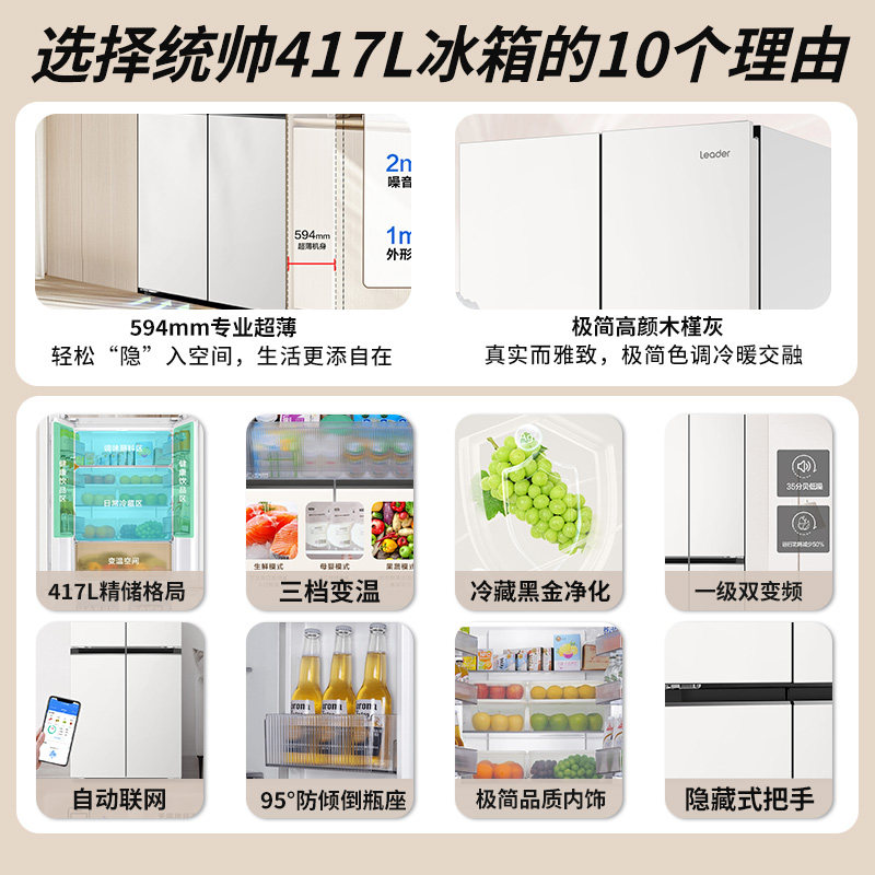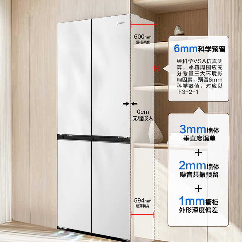 Leader海尔智家出品零嵌入十字门冰箱家用417L奶油风多门超薄旗舰