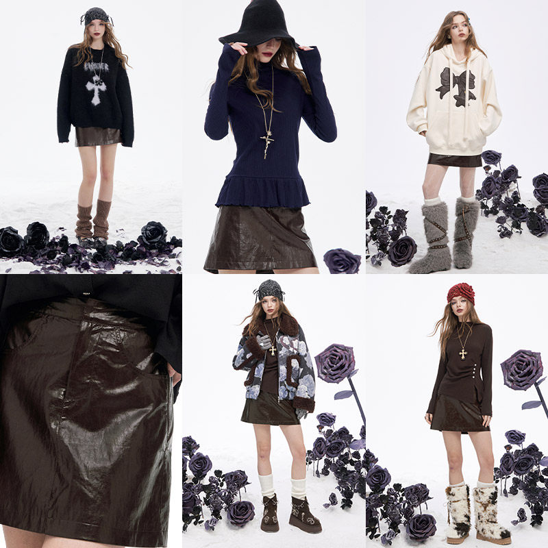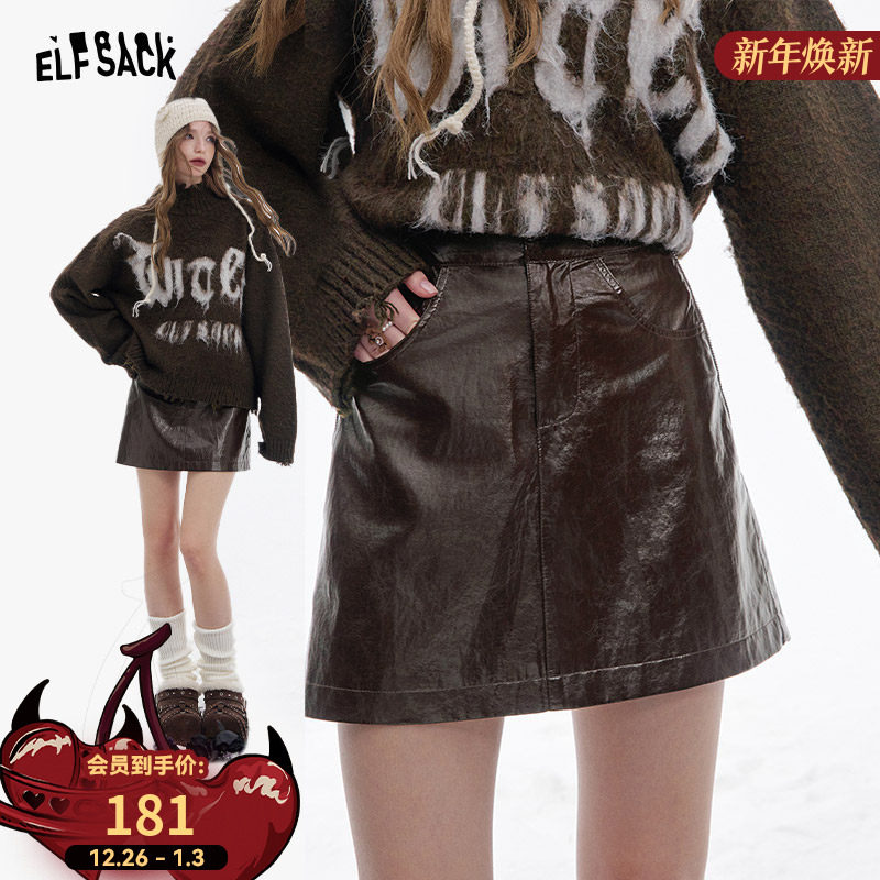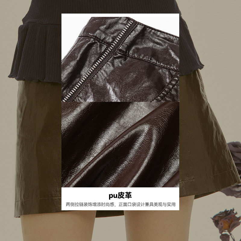 妖精的口袋咖色a字PU皮半身裙女2025年冬季新款显瘦甜酷短裙皮裙