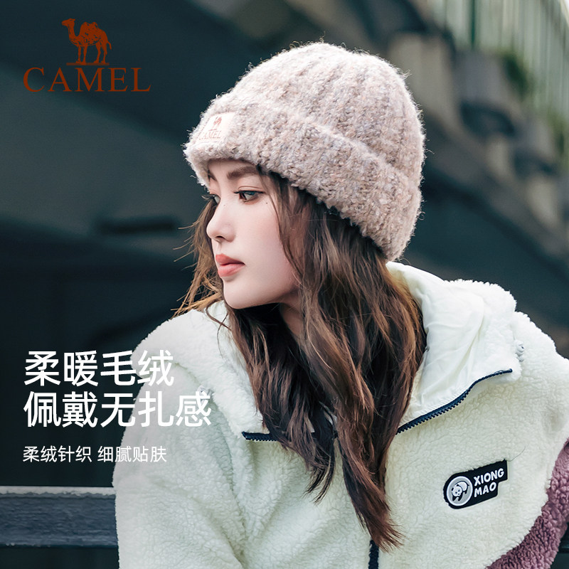骆驼针织帽显脸小羊毛混纺冬季女防风大头围冷帽保暖蓝色毛线帽子