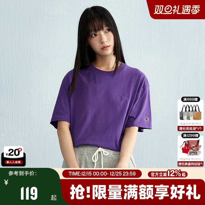 Champion冠军短袖男2025夏季新款刺绣纯棉T恤纯色休闲圆领刺绣女
