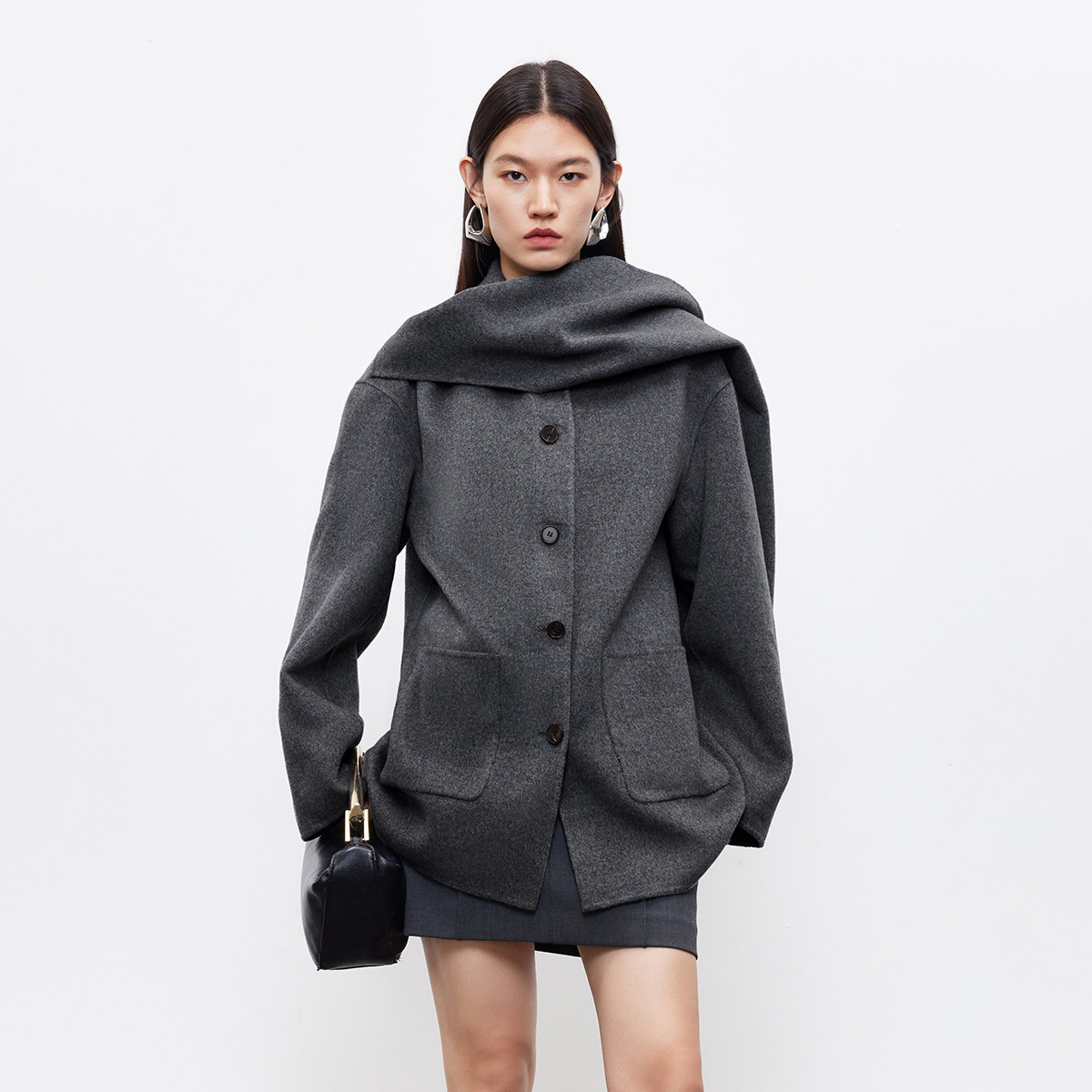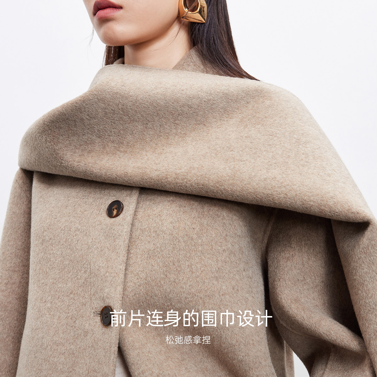 羊毛双面呢,H型版型,前片连身的围巾设计