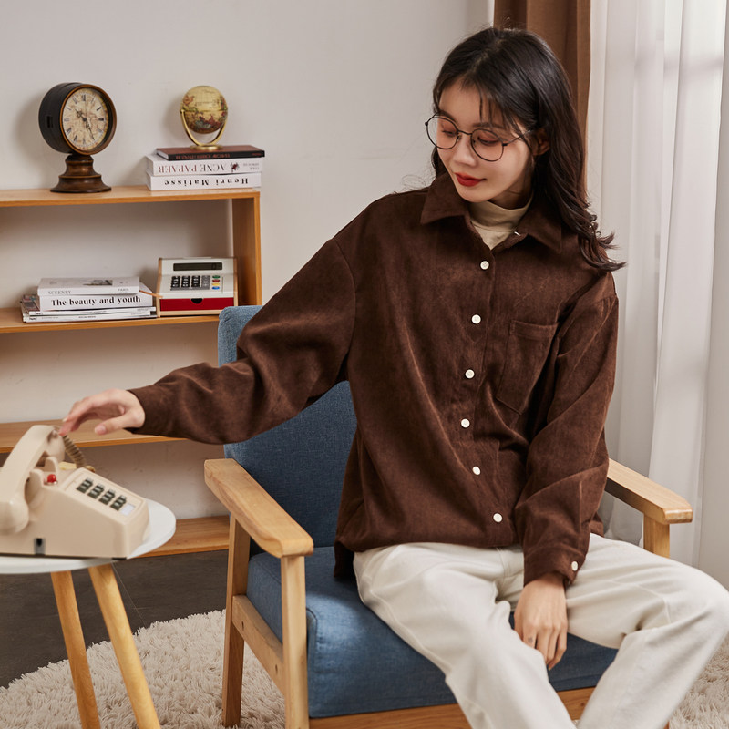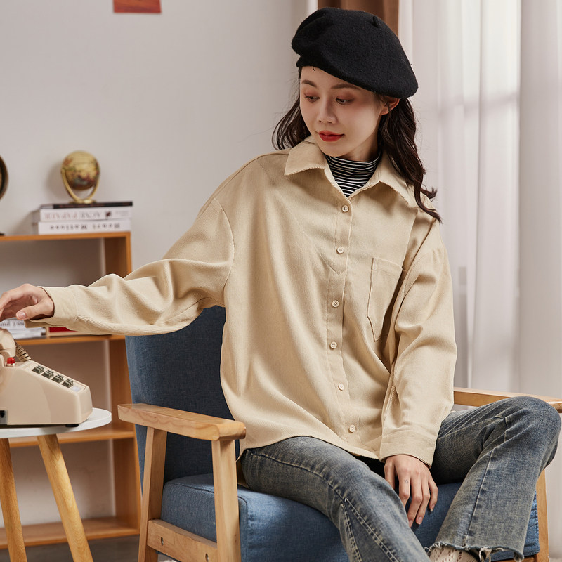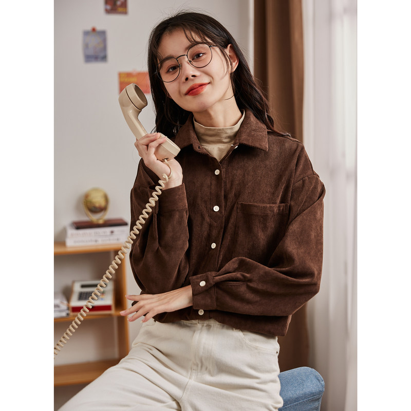 唐狮灯芯绒长袖衬衫女秋冬新款假两件衬衫衣服打底上衣叠穿设计感