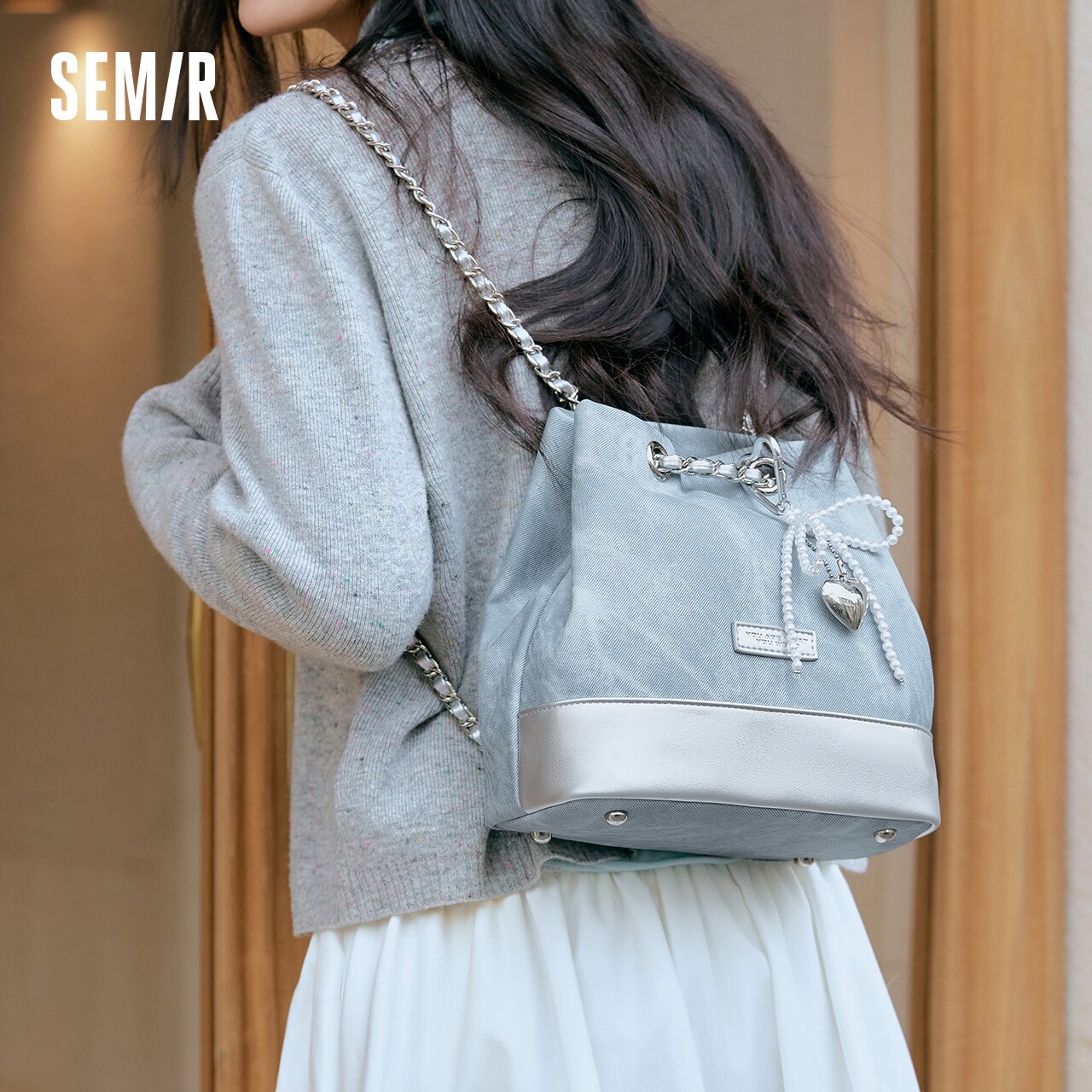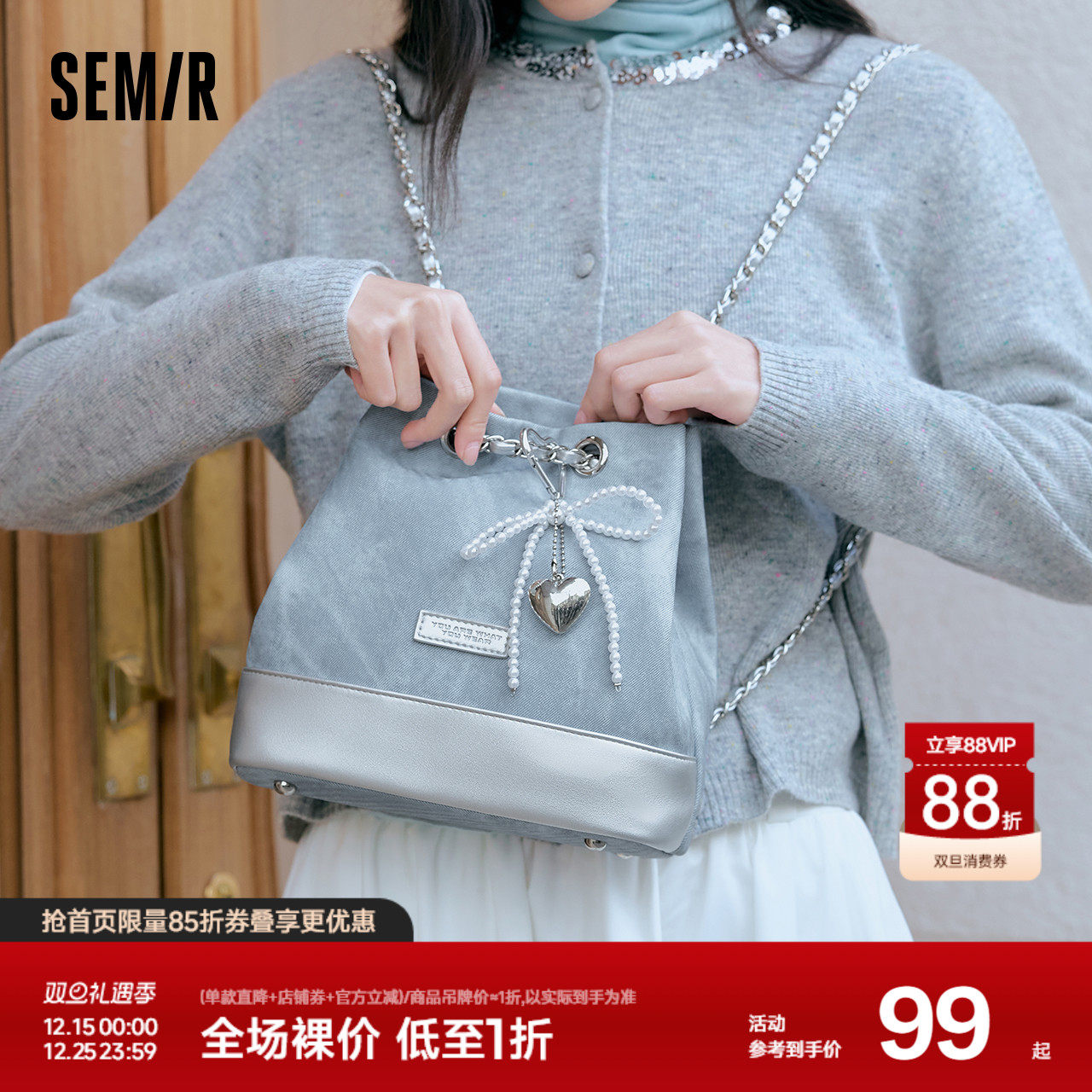 森马包包双肩包女2025新款时髦拼色仿牛仔水桶包蝴蝶结链条包流行