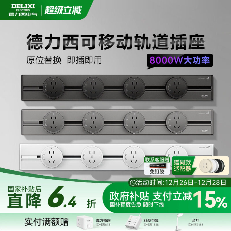 德力西可移动轨道插座厨房客厅卧室明装电力滑轨餐边柜插排8000W