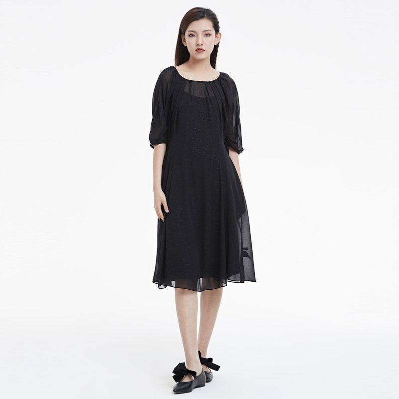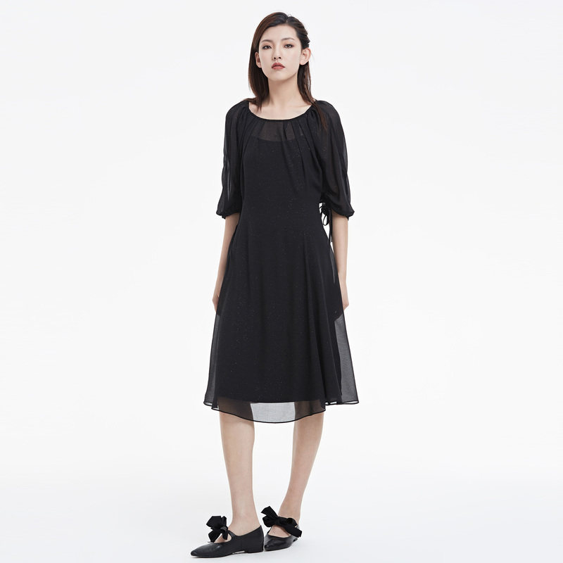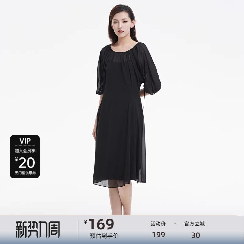 【热销补货】欧时力 褶皱短袖连衣裙女2026春新款收腰显瘦小黑裙
