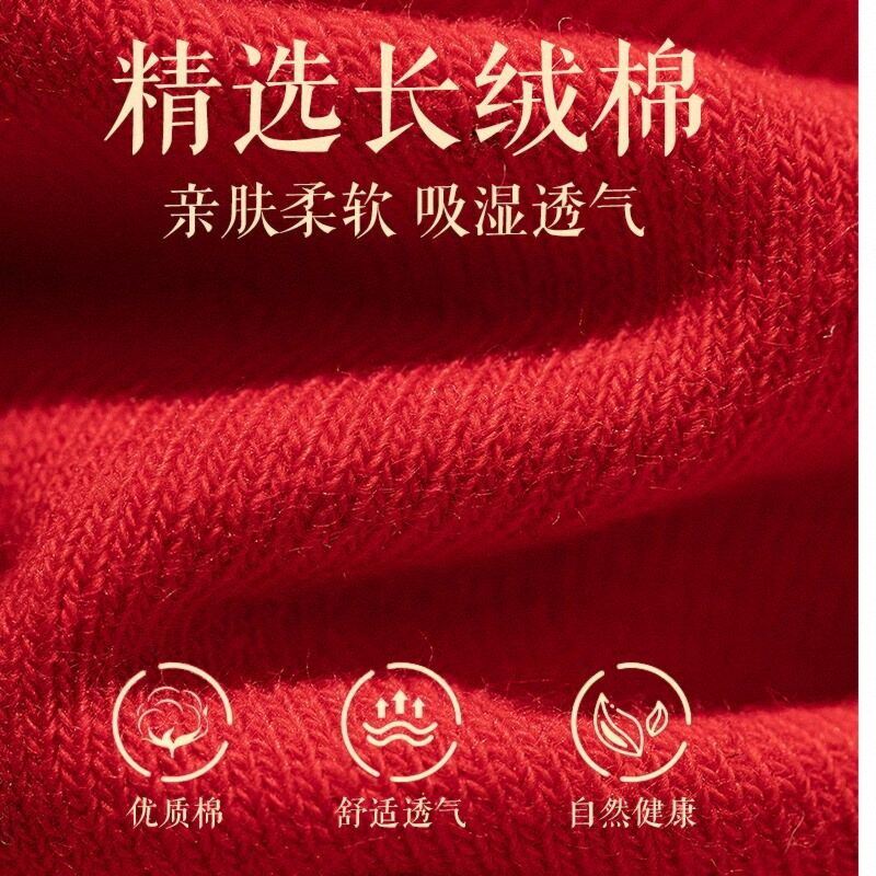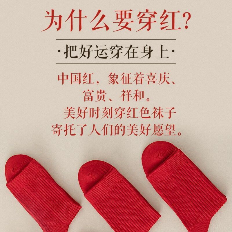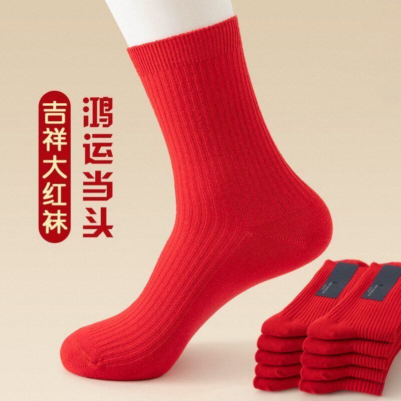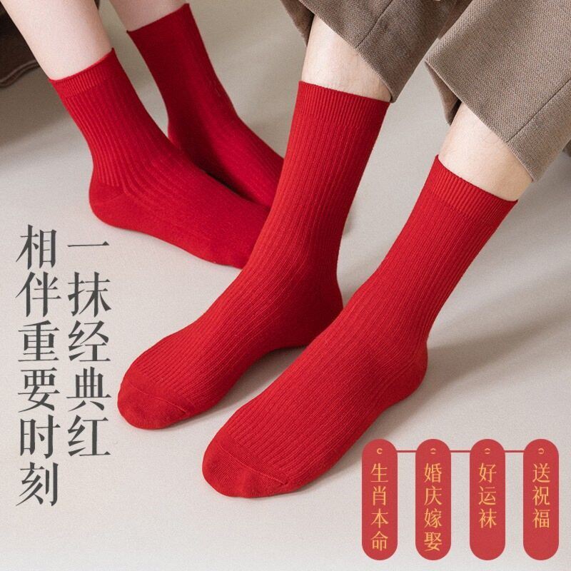 双针全棉红袜子男女本命年秋冬中筒袜抗菌防臭结婚情侣袜