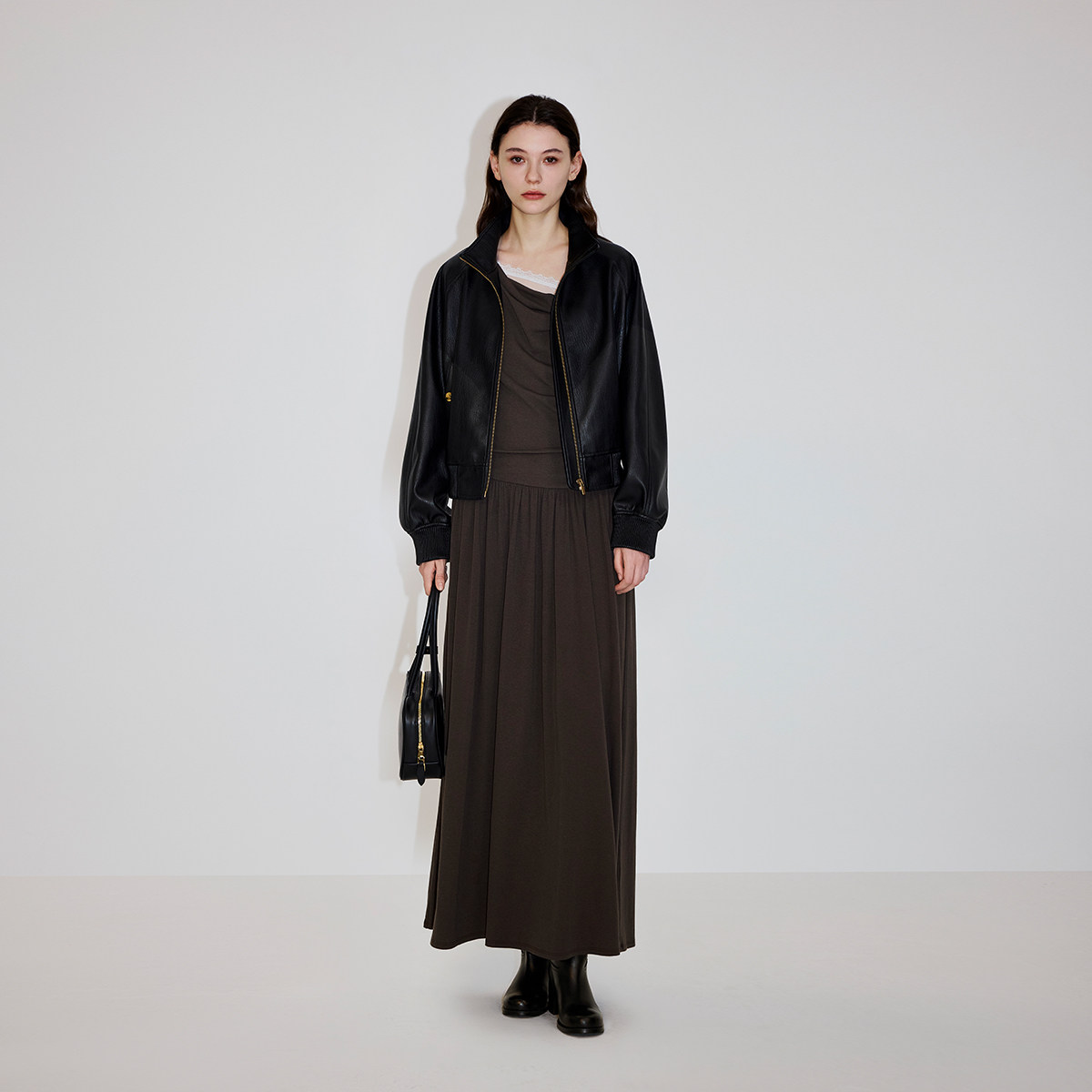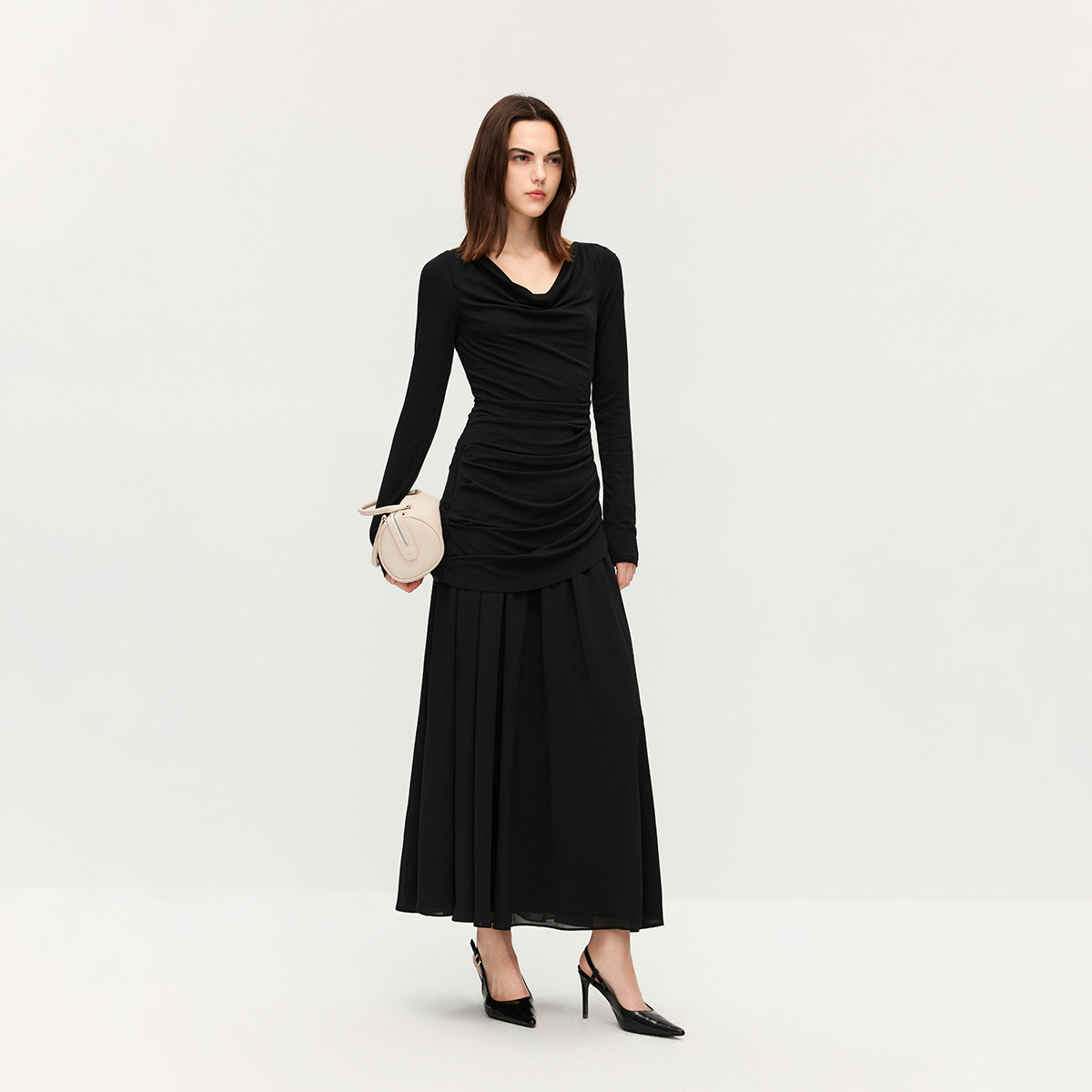 【新品】欧时力气质垂感A字连衣裙长裙收腰黑色显瘦2026春夏爆款1