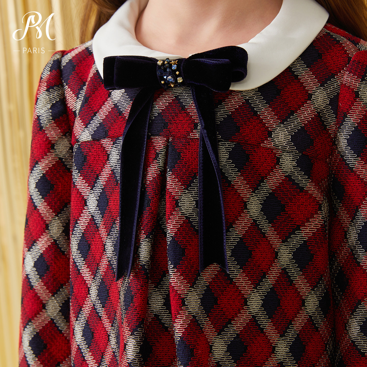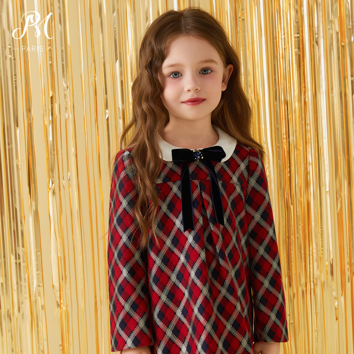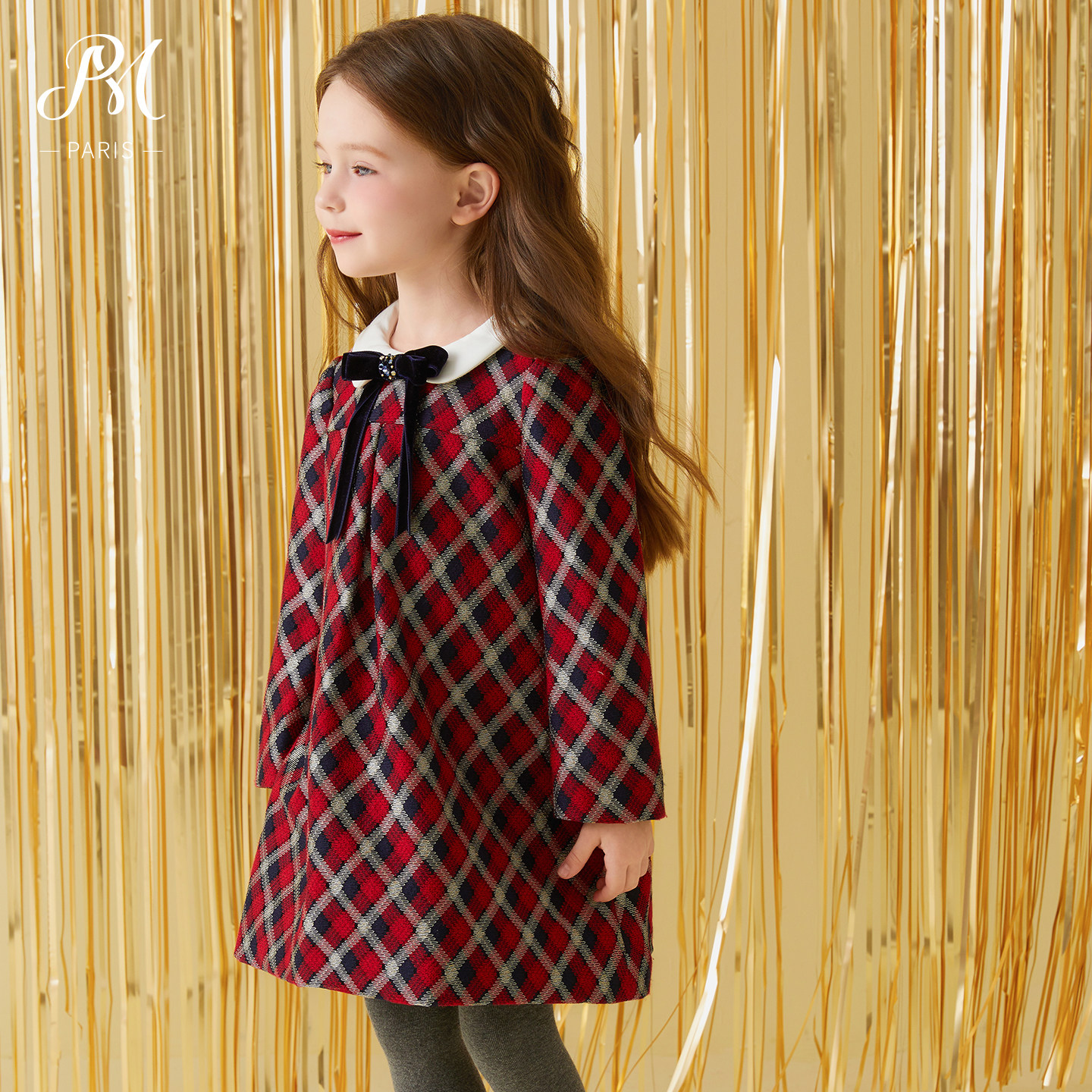 Petite Marguerite小雏菊童装秋冬长袖翻领红色格子蝴蝶结连衣裙