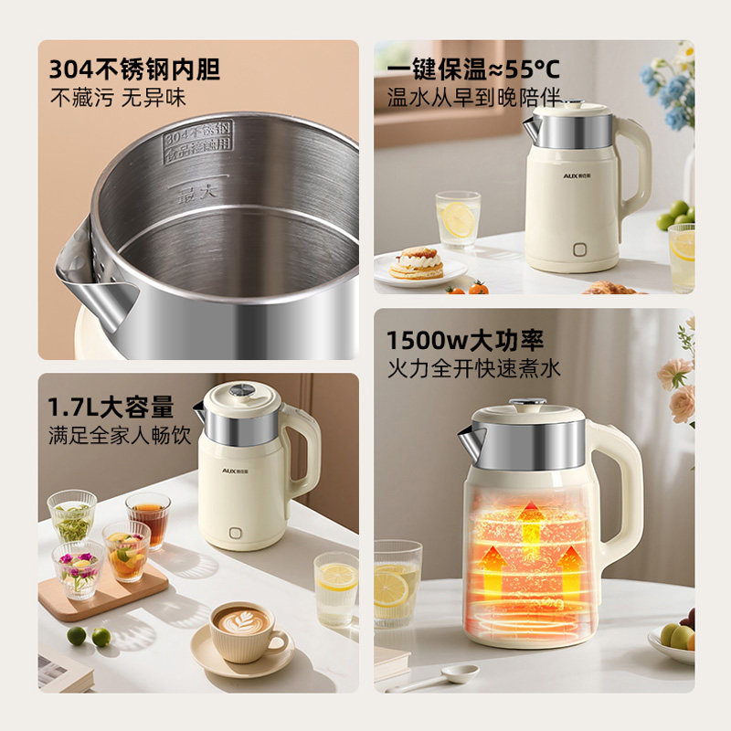 奥克斯新款保温电热水壶家用恒温智能开水壶304不锈钢烧水壶双层