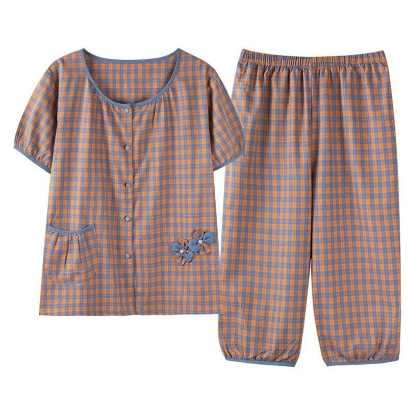 中老年人造棉睡衣女士夏季全棉绸短袖套装绵绸妈妈装加大码家居服