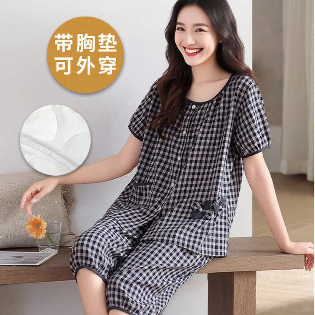 红豆睡衣女款夏季带胸垫纯棉短袖七分裤可爱公主高级可外穿家居服
