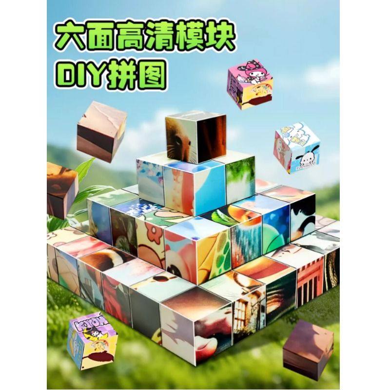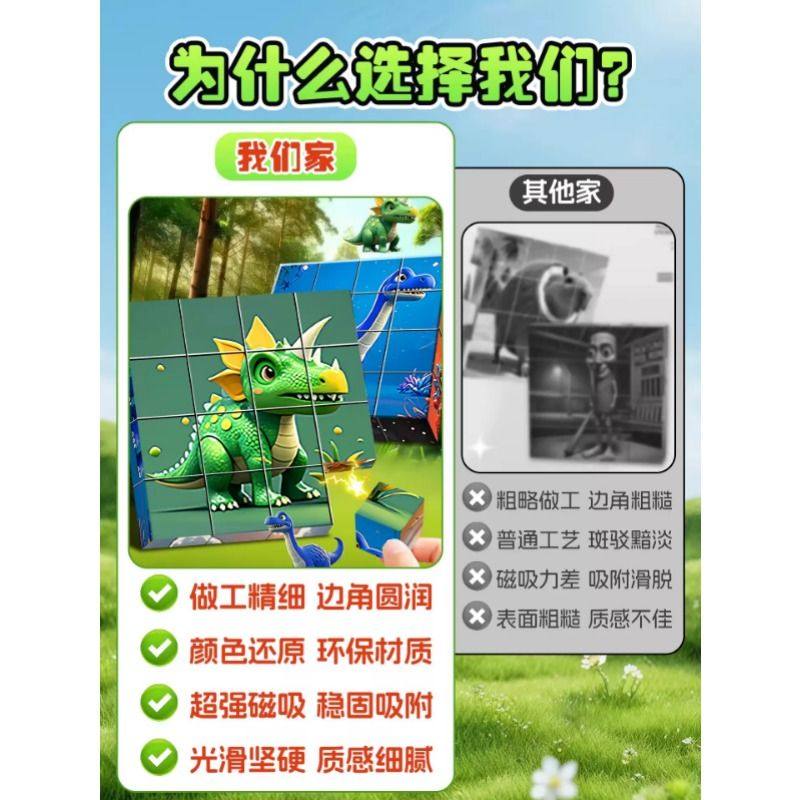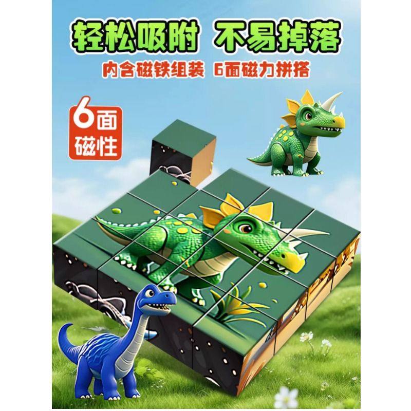 磁力方块拼图早教益智动物积木卡通六面画立体霸王龙拼图玩具塑胶