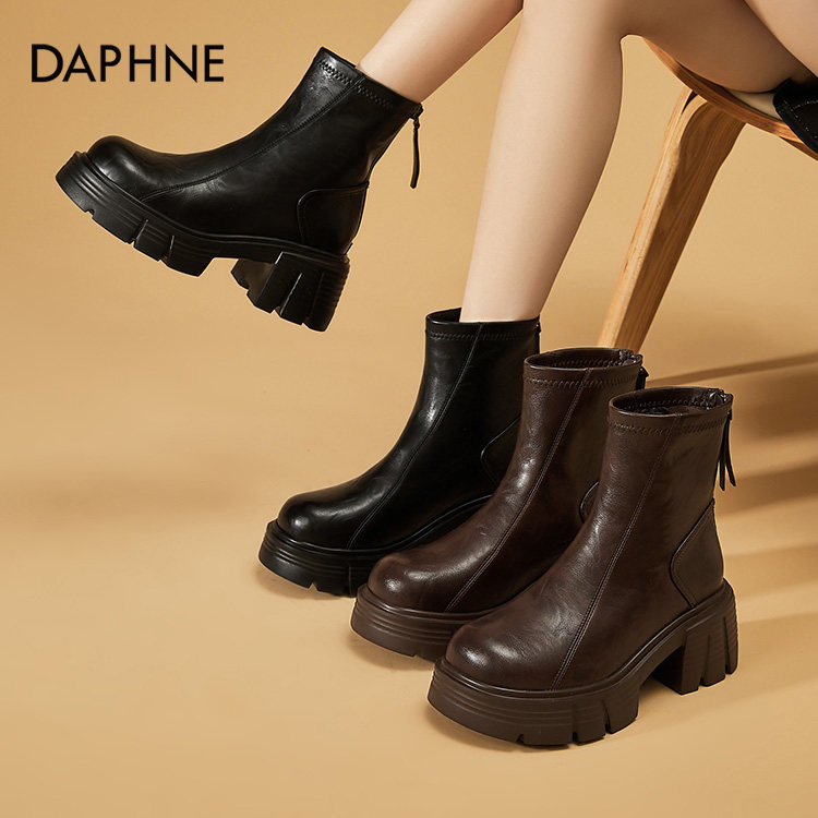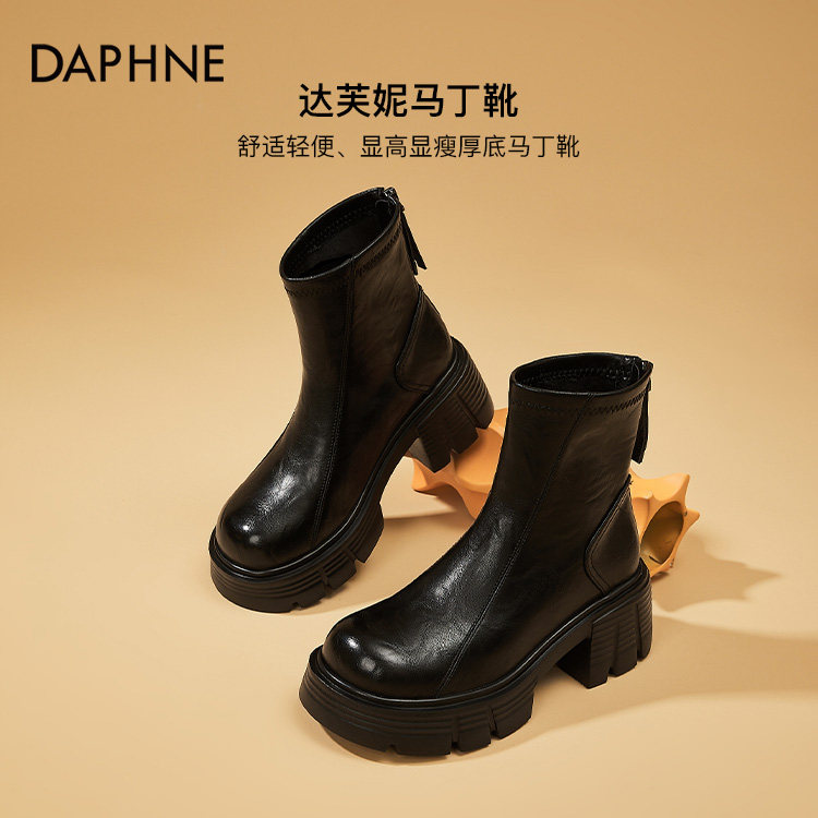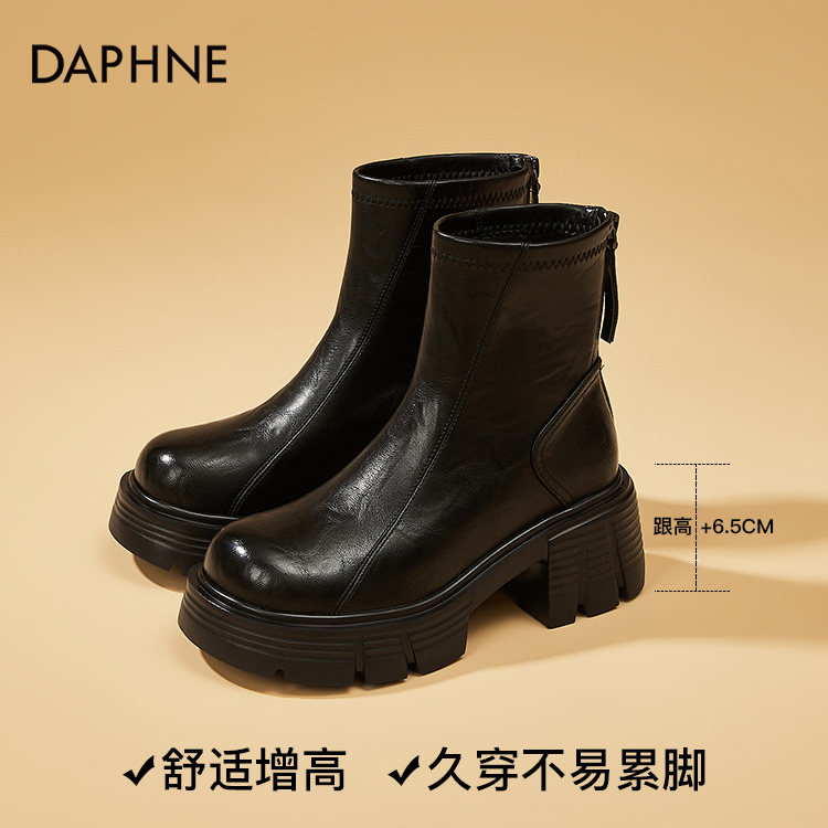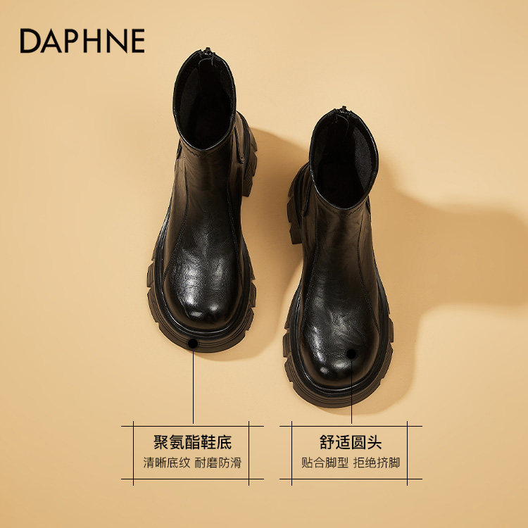 达芙妮女鞋真皮切尔西靴子女黑色短靴烟筒厚底马丁靴女款秋冬女靴