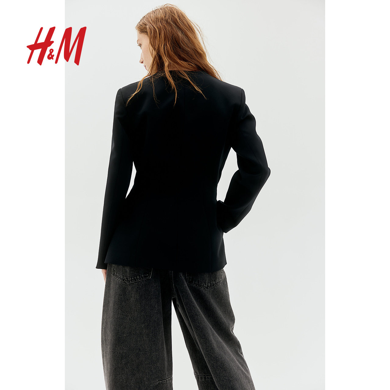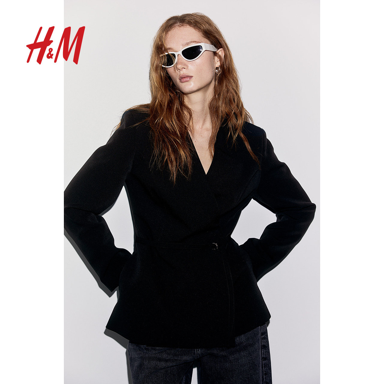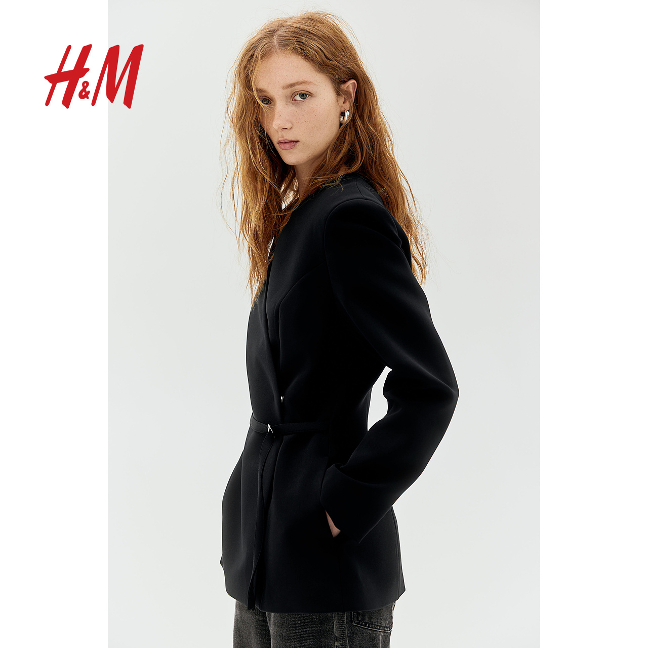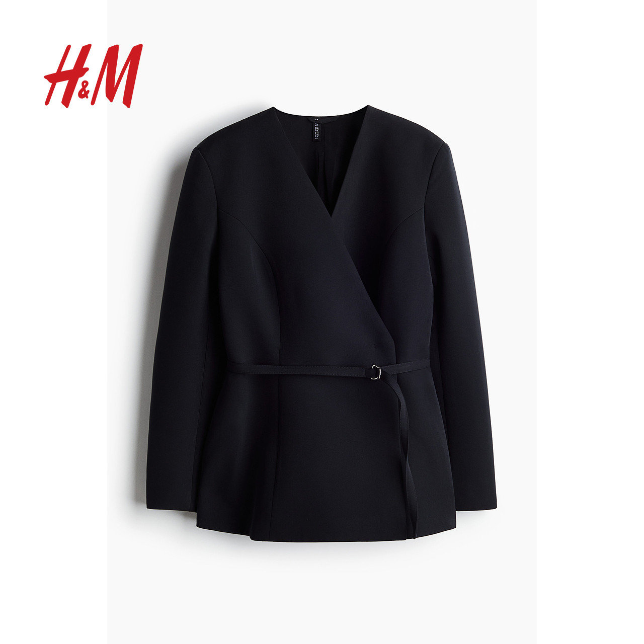 HM女装西装春季配腰带围裹式V领气质宽松长袖通勤西服外套1270608