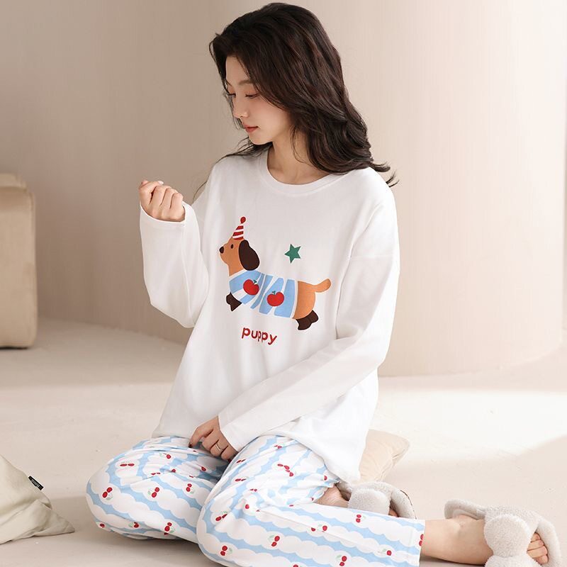 安比斯情侣睡衣舒适纯棉秋季女长袖男女同款休闲家居服套装可出门