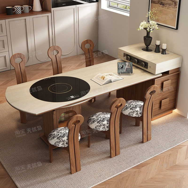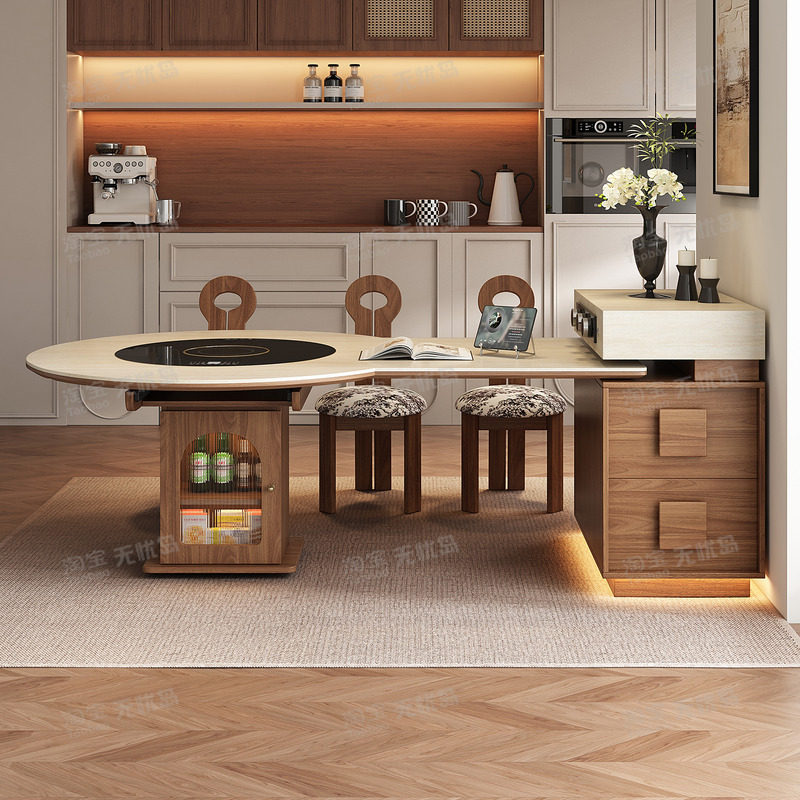 新款中古风圆形岛台餐桌一体家用客厅可伸缩小户型厨房多功能导台