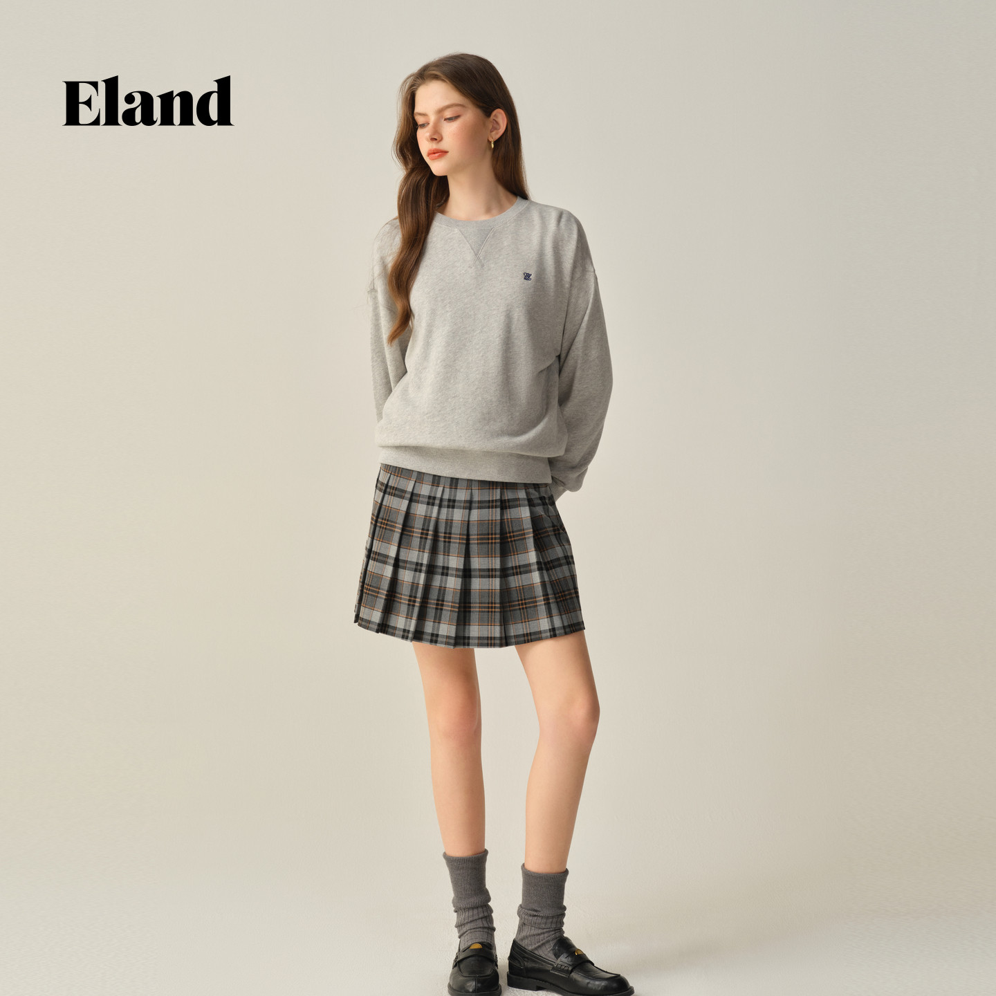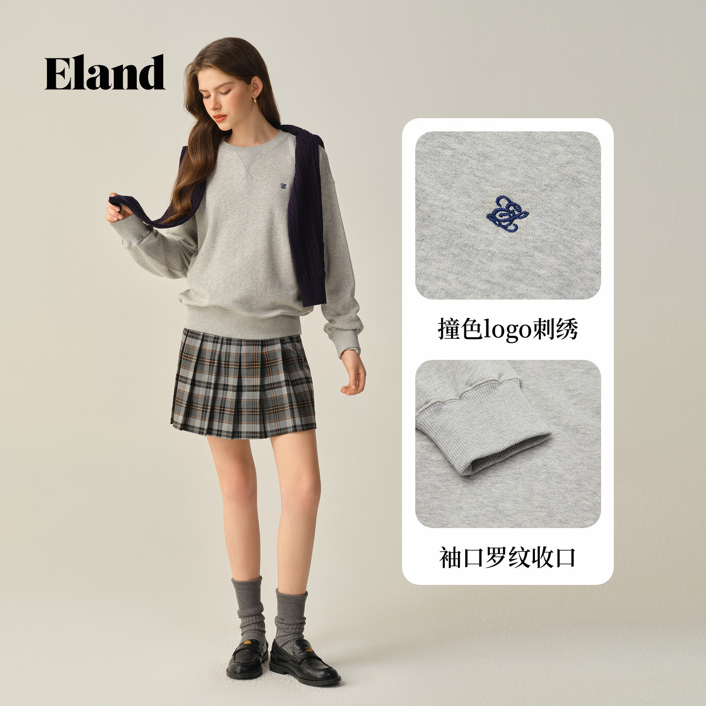 【100%棉】Eland衣恋卫衣女纯色圆领长袖休闲上衣2025冬季新款